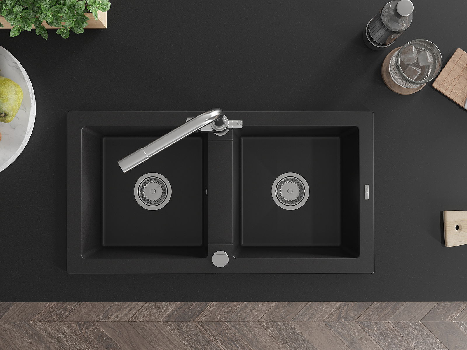 Mexen Mario granite sink with 2 compartments and Duero kitchen tap, black - 6504-77-671600-00