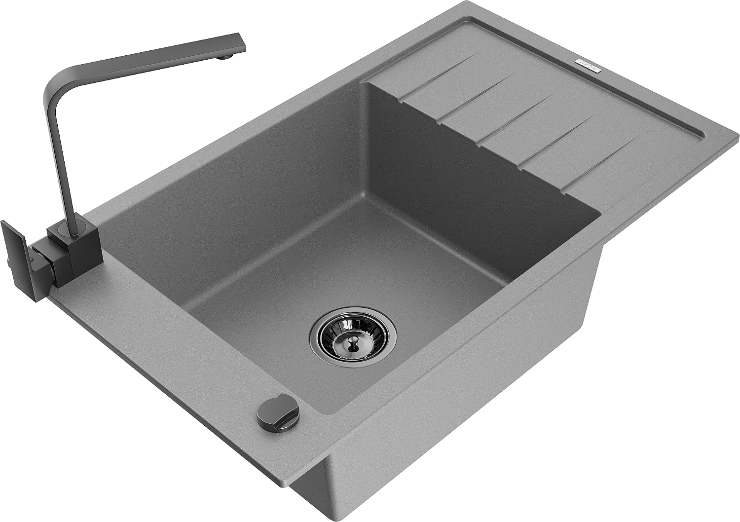 Mexen Elias 1-bowl granite sink with drainer and Rita kitchen tap, grey - 6511-71-670300-70-B