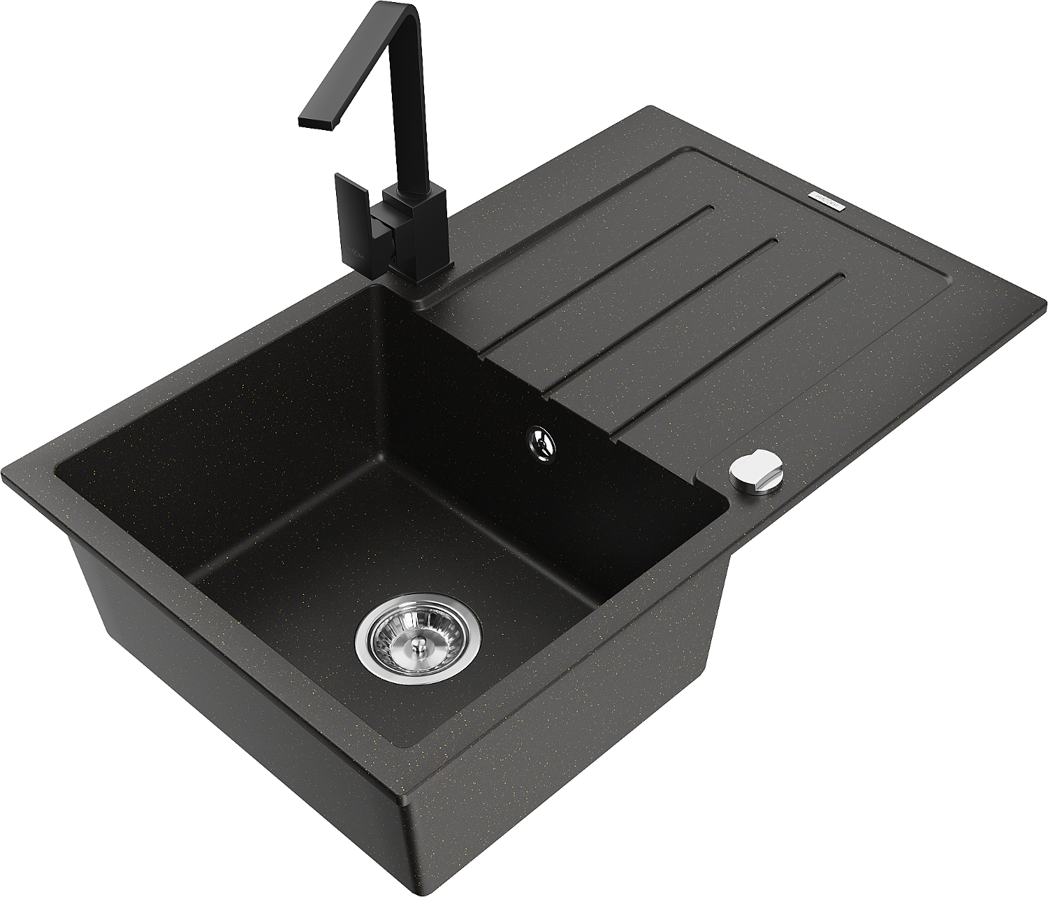 Mexen Bruno 1-Bowl Granite Sink with Drainer and Rita Kitchen Tap, Black/Gold Metallic - 6513-75-670300-70