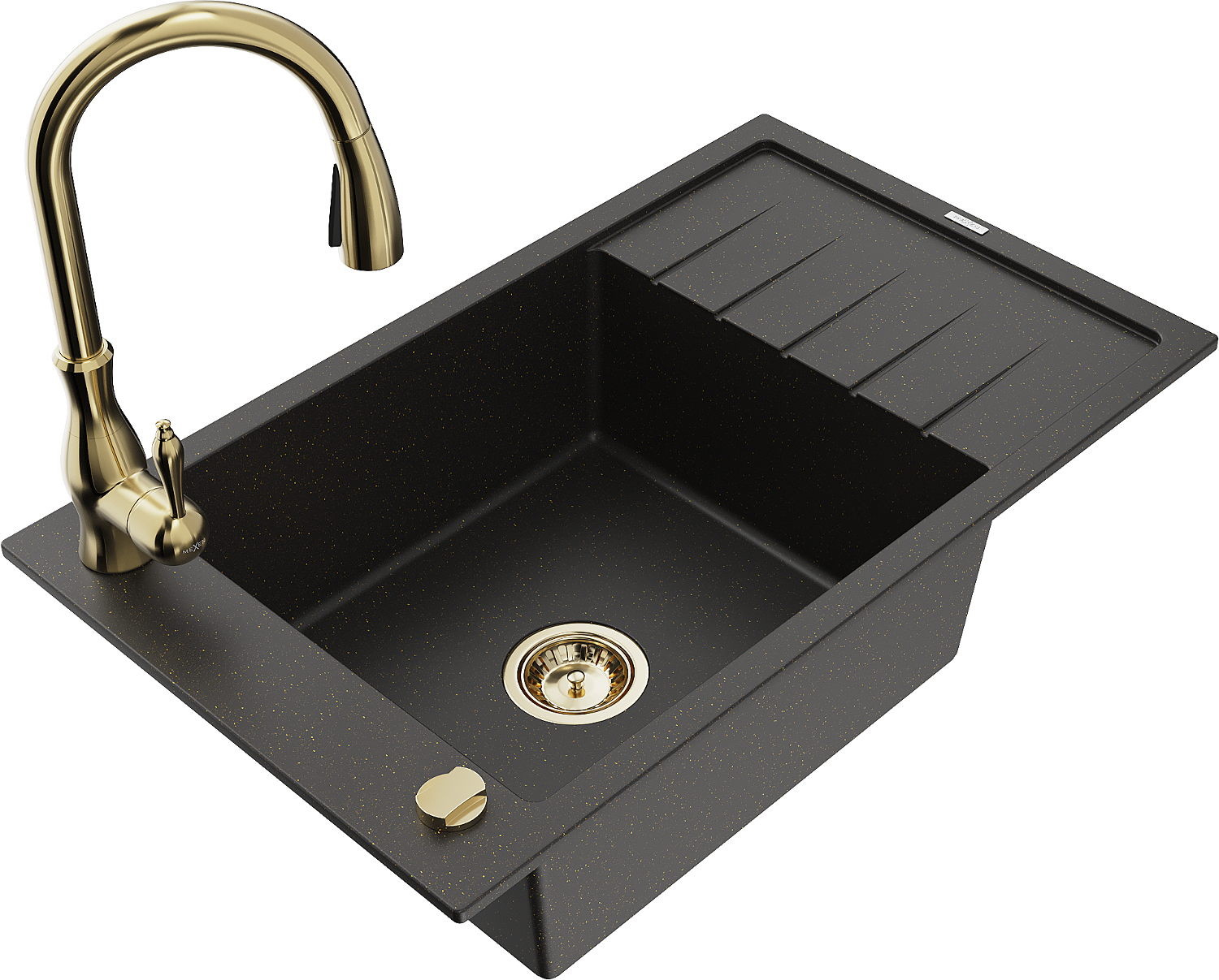 Mexen Elias granite single-bowl sink with drainer and Savita kitchen tap, black/gold metallic - 6511-75-672601-50