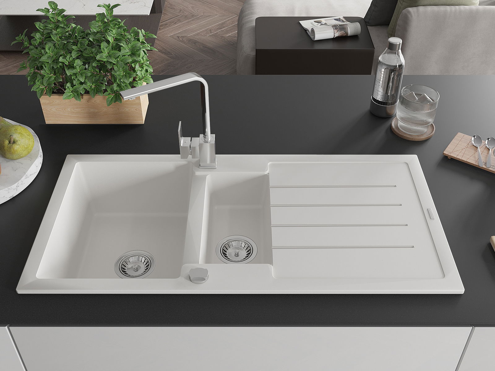 Choosing a sink with a draining board is a practical solution that allows you to set aside washed dishes or vegetables and fruits. The draining board makes daily cooking easier and helps maintain order in the kitchen.