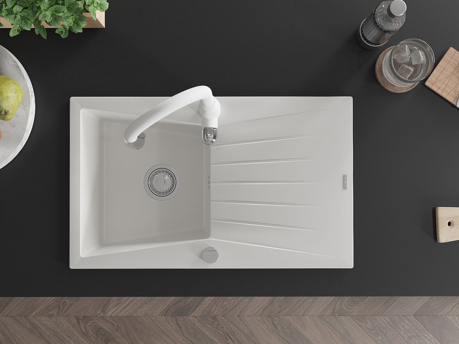 Mexen Cesar granite sink 1-bowl with drainer and Savita kitchen tap, white - 6514-20-672601-20