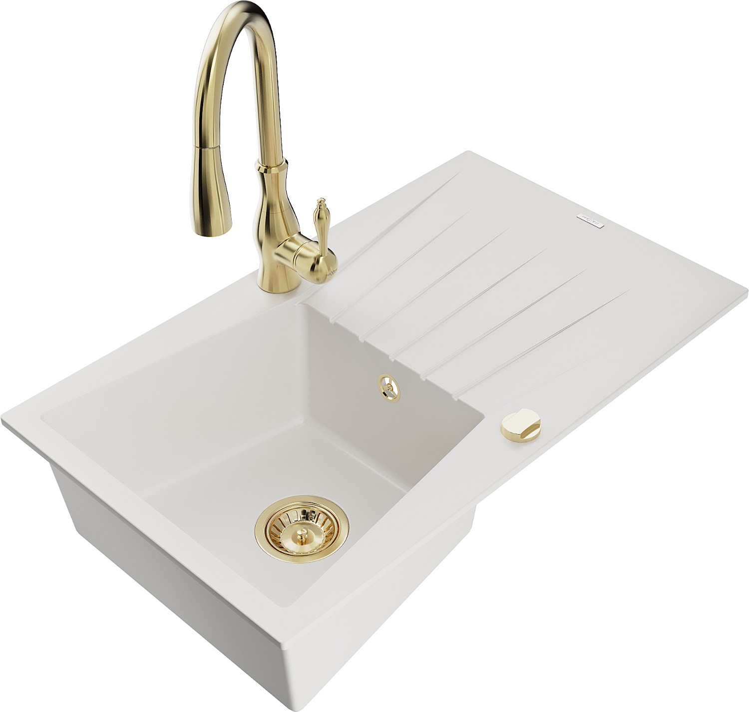 Mexen Cesar granite sink 1-bowl with drainer and Savita kitchen tap, white - 6514-20-672601-50