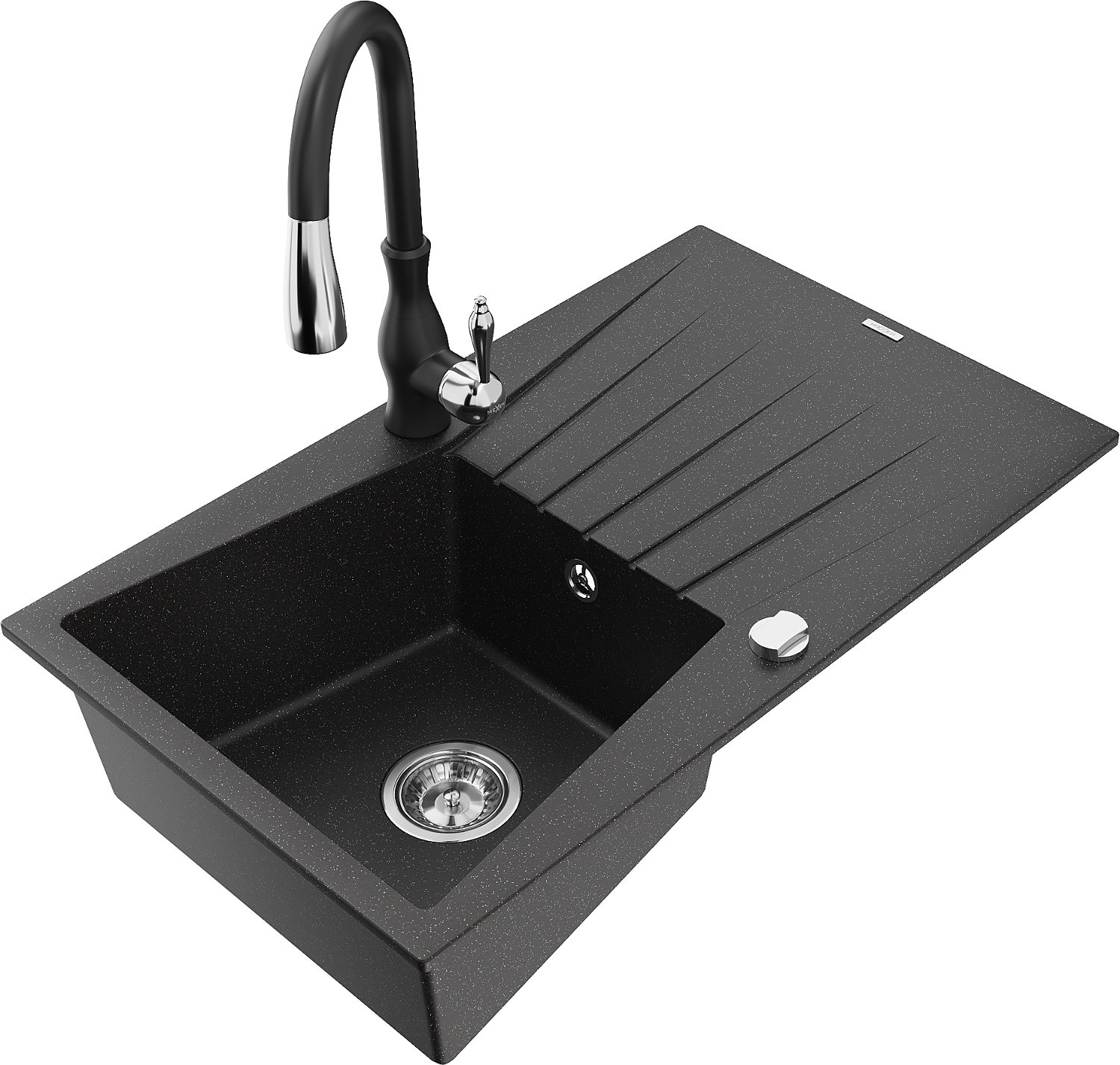 Mexen Cesar 1-bowl granite sink with drainer and Savita kitchen tap, black/silver metallic - 6514-73-672601-70
