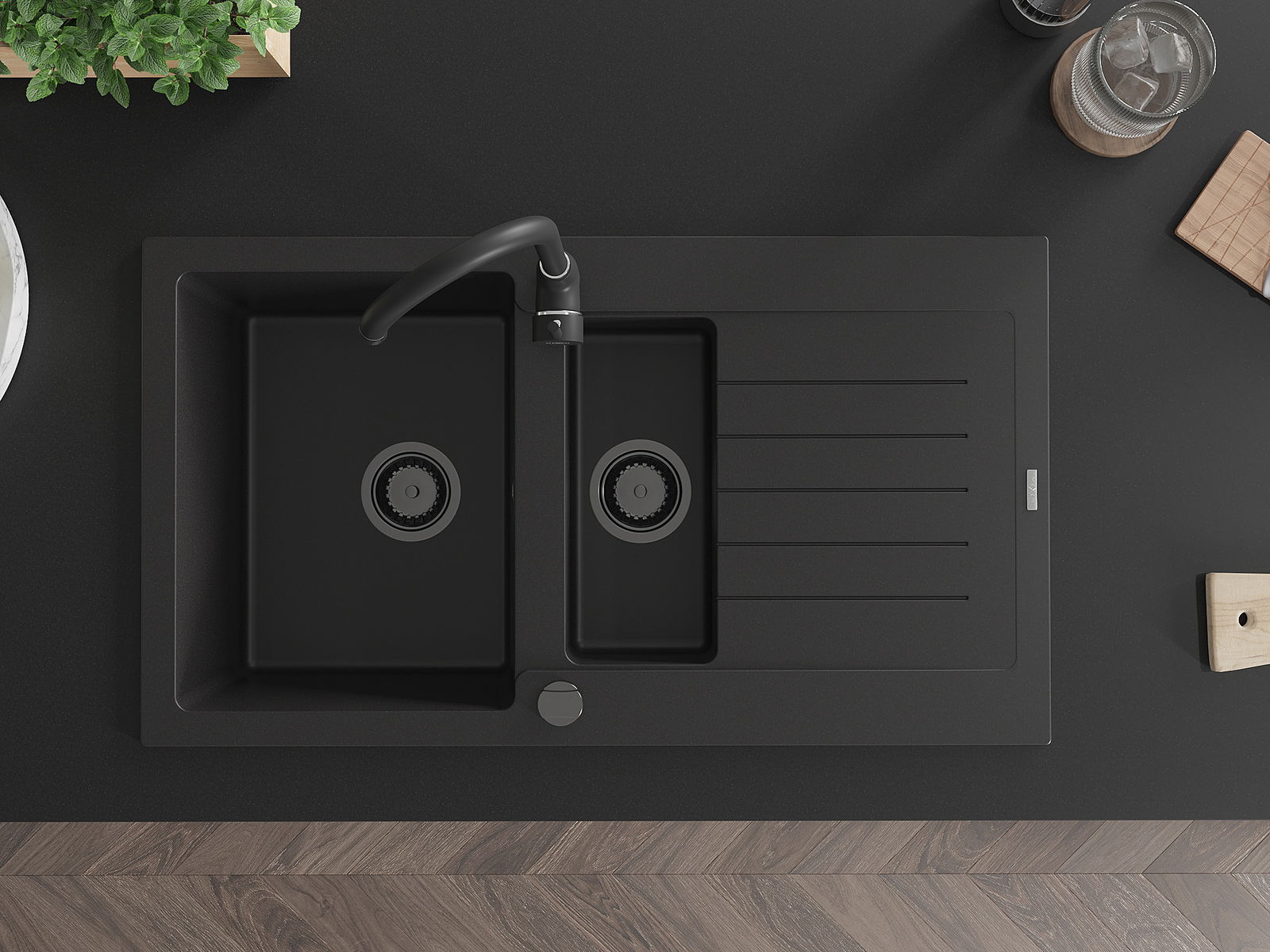 Mexen Matias granite sink 1.5-bowl with drainer and Telma kitchen tap, black - 6502-77-670200-70-B