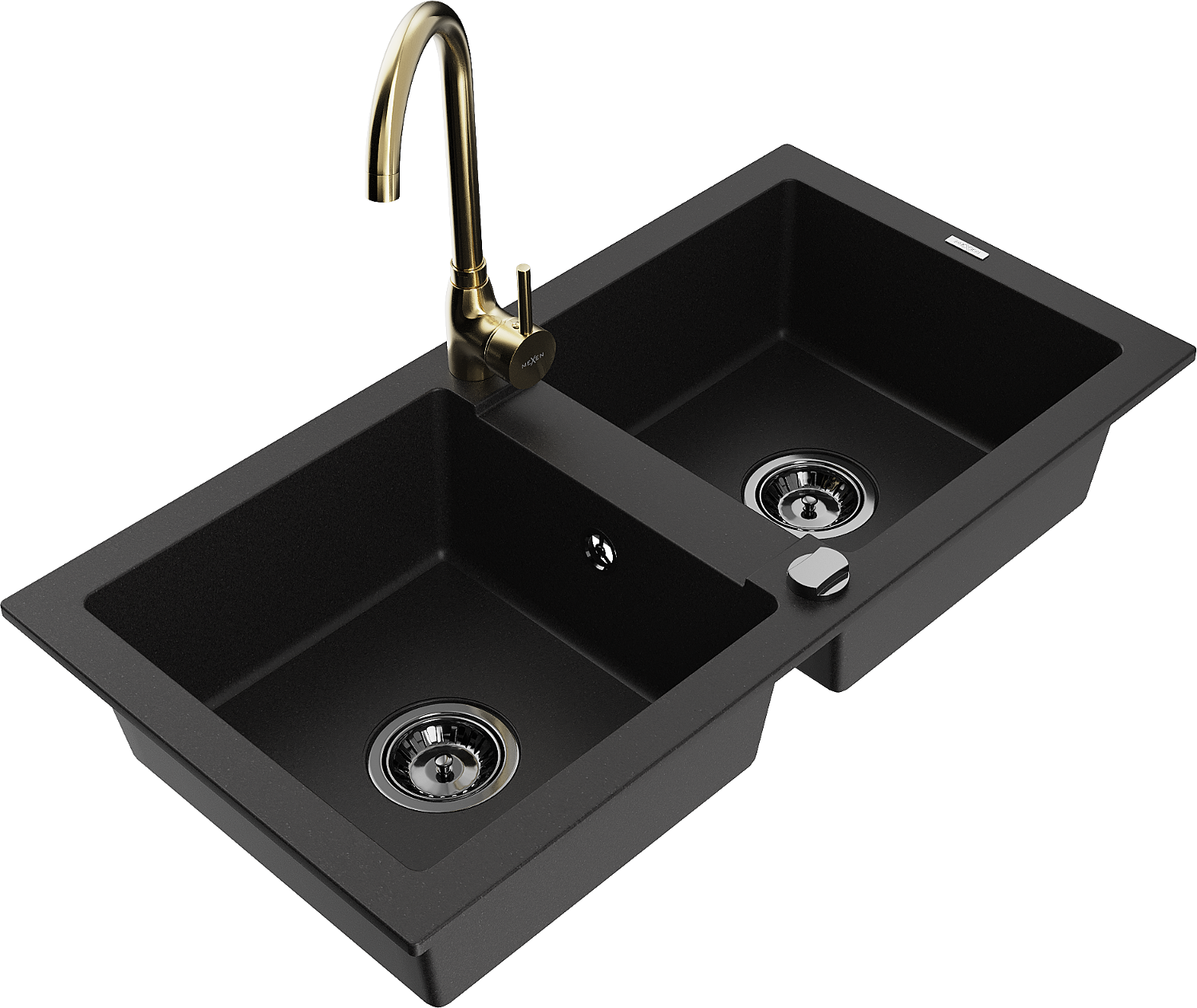 Mexen Mario 2-bowl granite sink with Telma kitchen tap, black - 6504-77-670200-50-B
