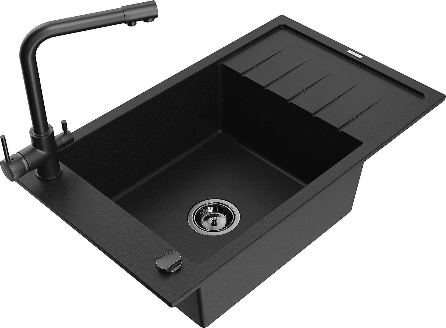 Mexen Elias granite sink 1-bowl with drainer and Duero kitchen tap, black - 6511-77-671600-70-B