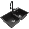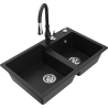 Mexen Tomas granite kitchen sink 2-bowl with Savita kitchen tap, black speckled - 6516-76-672601-70