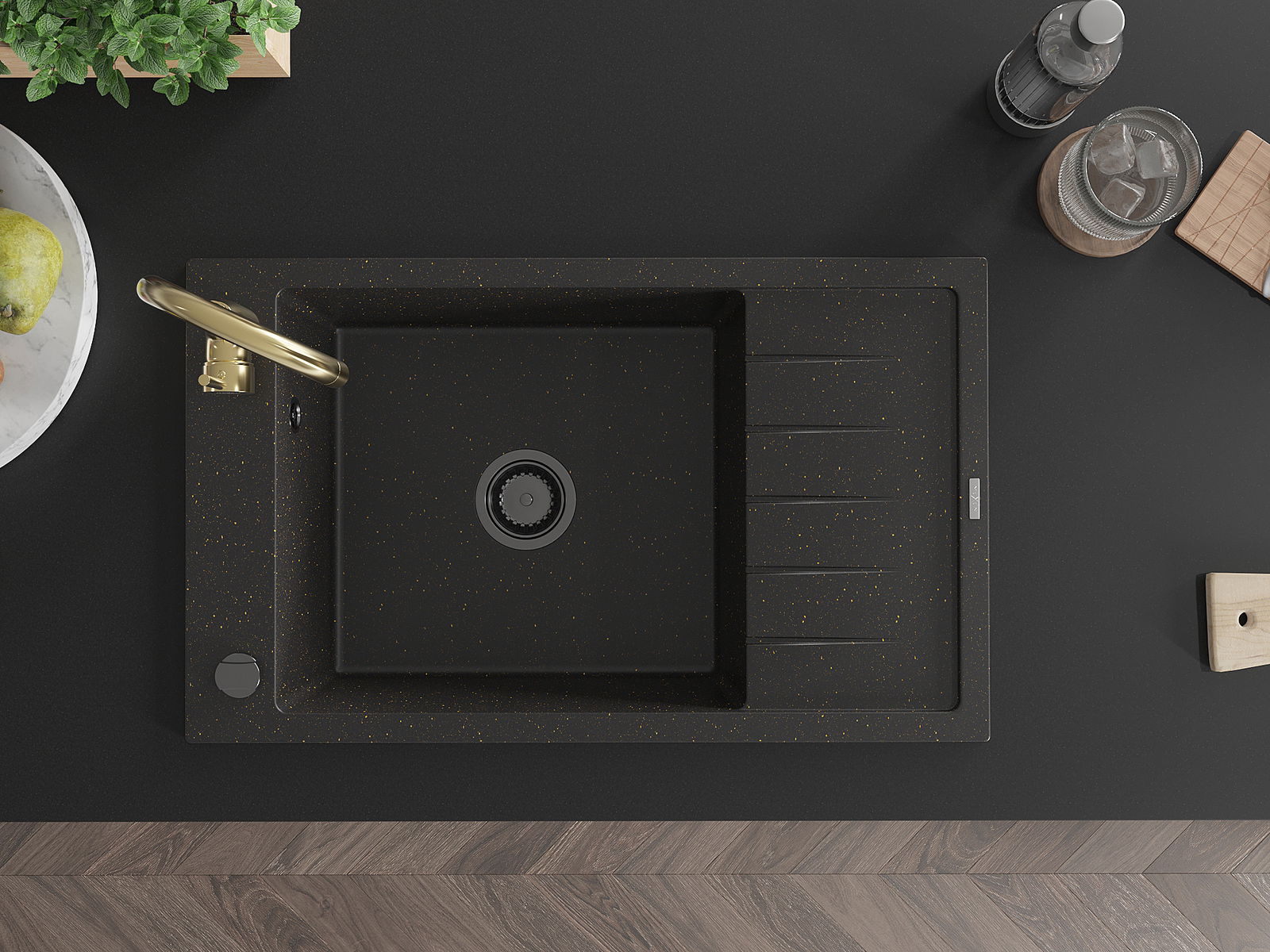Mexen Elias granite sink 1-bowl with drainer and Telma kitchen tap, black/gold - 6511-75-670200-50-B