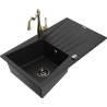 Mexen Cesar single-bowl granite sink with drainer and Carla kitchen tap, black/gold metallic - 6514-75-670700-50-B