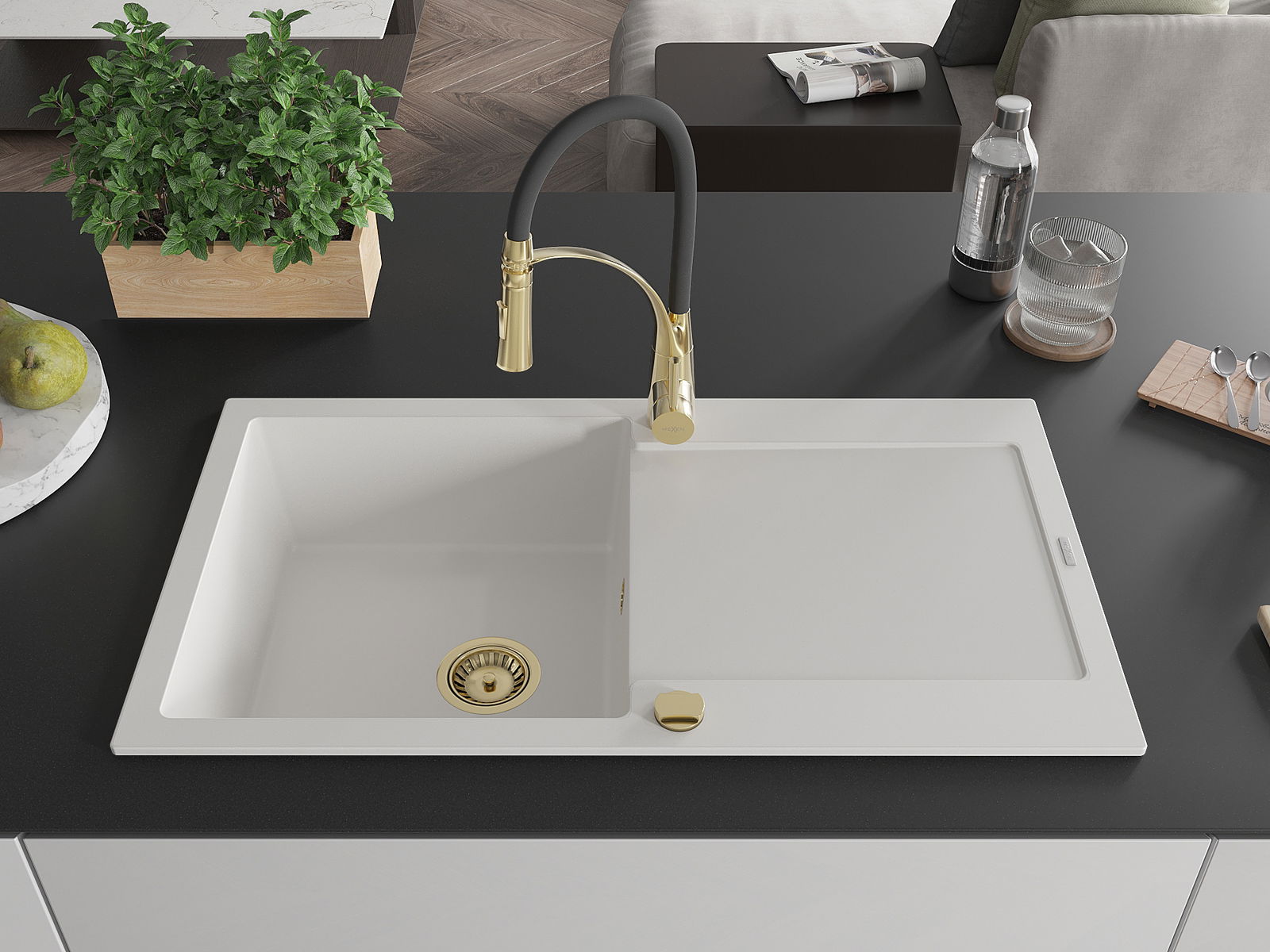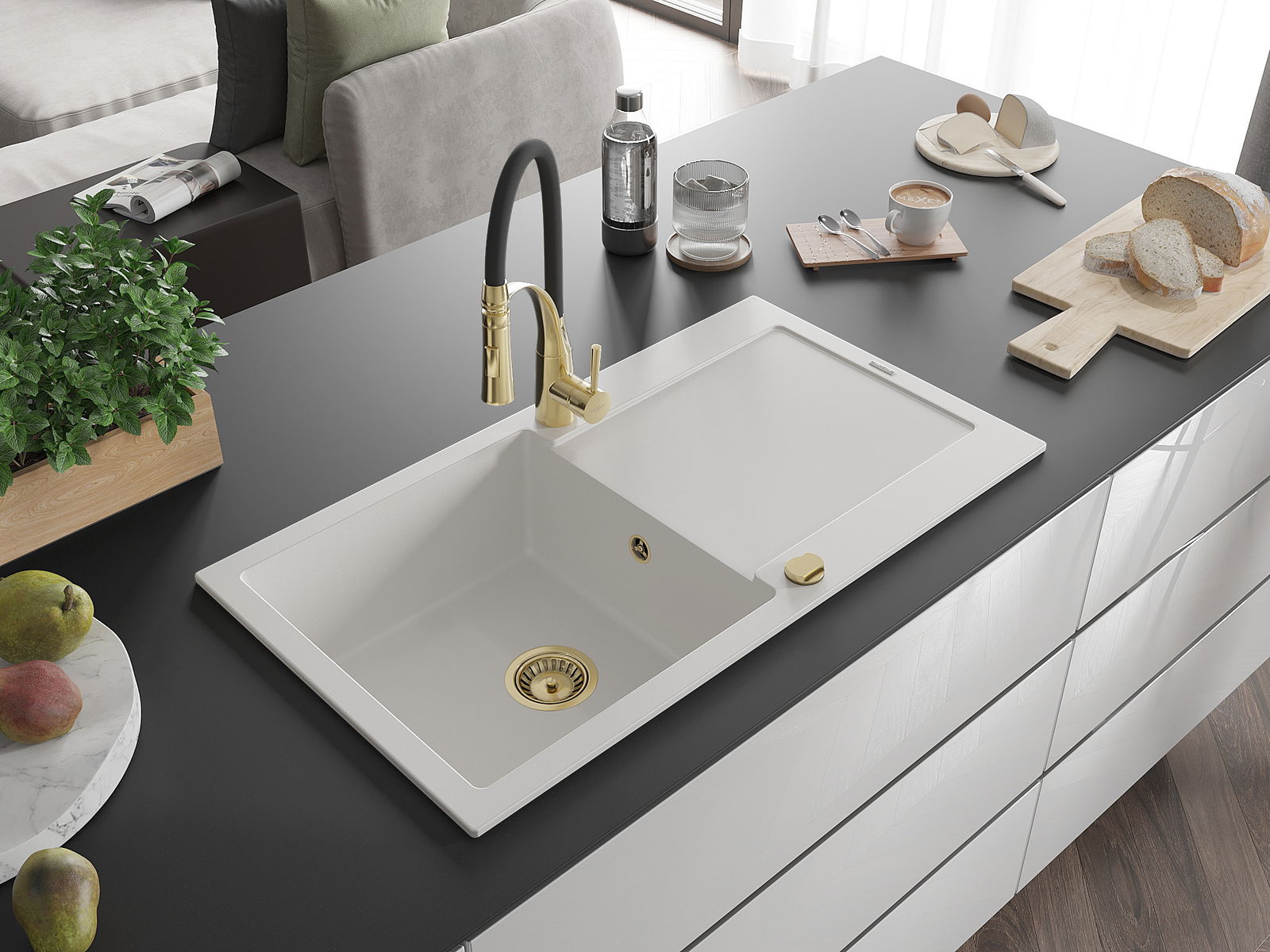 Choosing a sink with a draining board is a practical solution that allows you to set aside washed dishes or vegetables and fruits. The draining board makes daily cooking easier and helps maintain order in the kitchen.