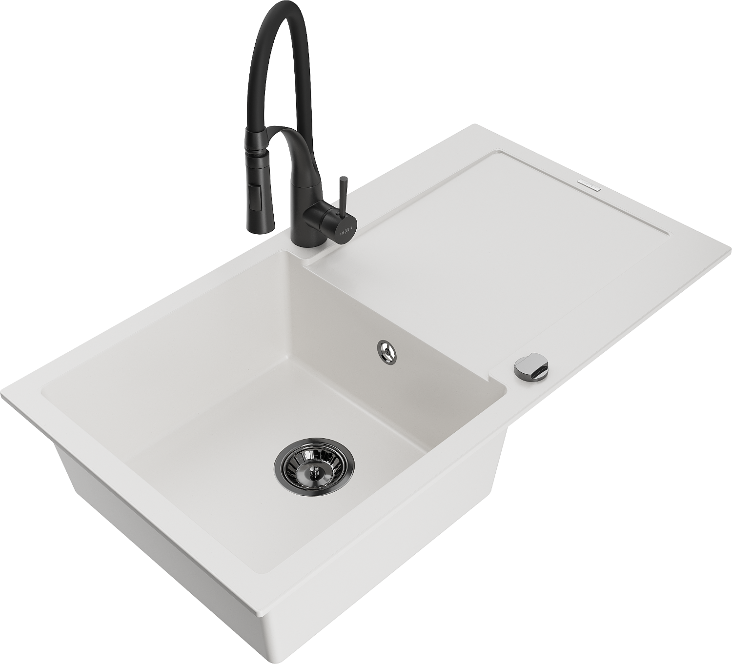 Mexen Leo granite sink 1-bowl with drainer and Aster kitchen tap, white - 6501-20-73450-70-B