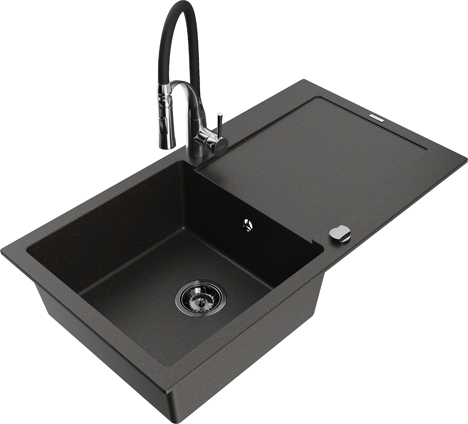 Mexen Leo 1-bowl granite sink with drainer and Aster kitchen tap, black/gold metallic - 6501-75-73450-07-B