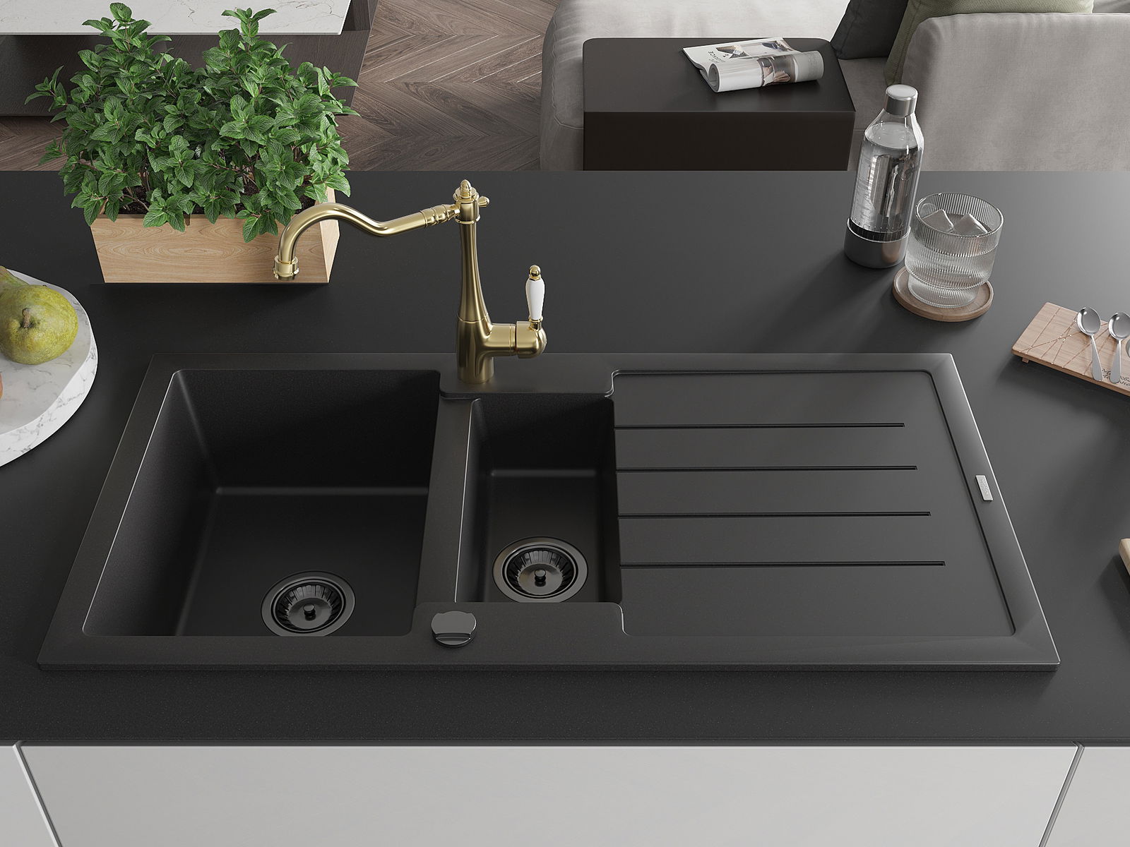 Choosing a sink with a draining board is a practical solution that allows you to set aside washed dishes or vegetables and fruits. The draining board makes daily cooking easier and helps maintain order in the kitchen.