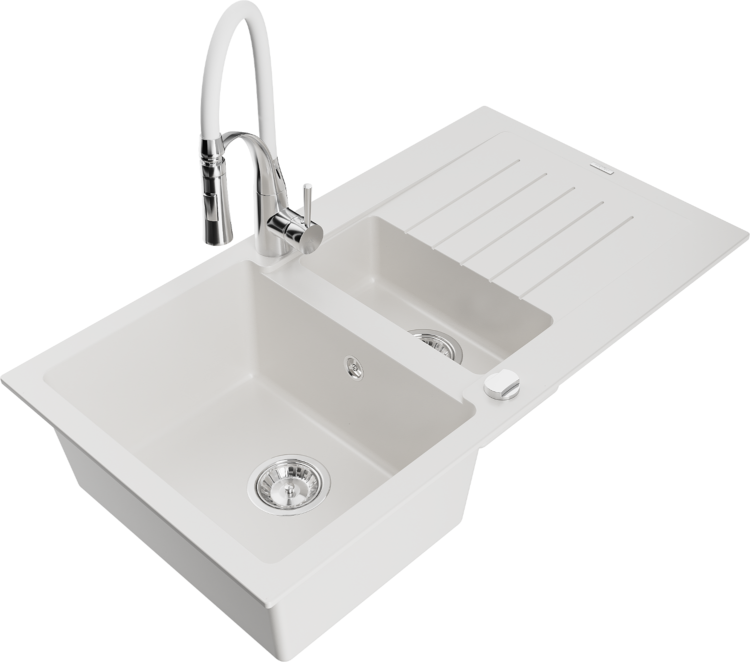 Mexen Matias granite sink 1.5-bowl with drainer and Aster kitchen tap, white - 6502-20-73450-02