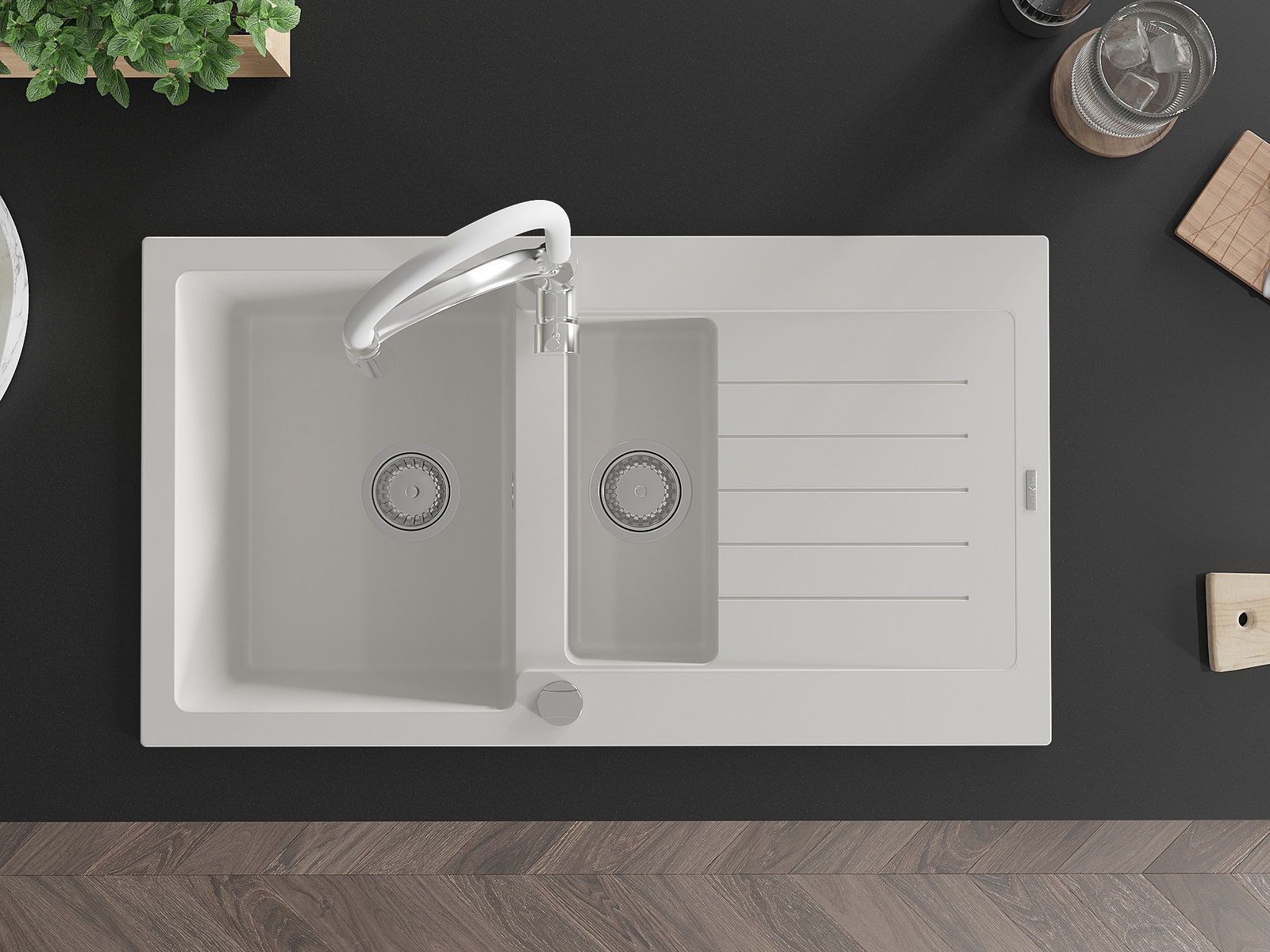 Choosing a sink with a draining board is a practical solution that allows you to set aside washed dishes or vegetables and fruits. The draining board makes daily cooking easier and helps maintain order in the kitchen.