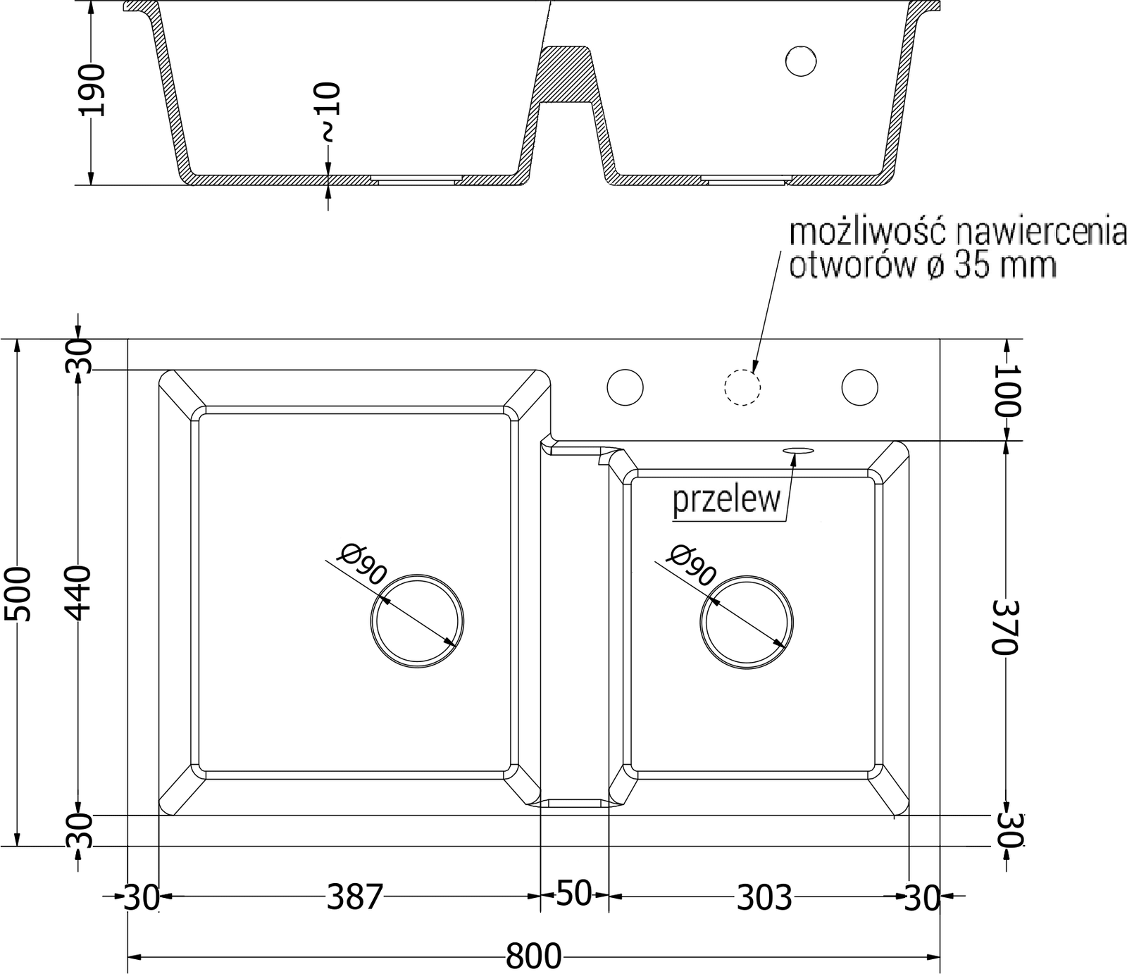 The sink has a pre-drilled 35 mm diameter hole for self-punching. It can be used, among other things, for installing a liquid dispenser, which will eliminate the presence of plastic bottles in the kitchen and give it an elegant finish.