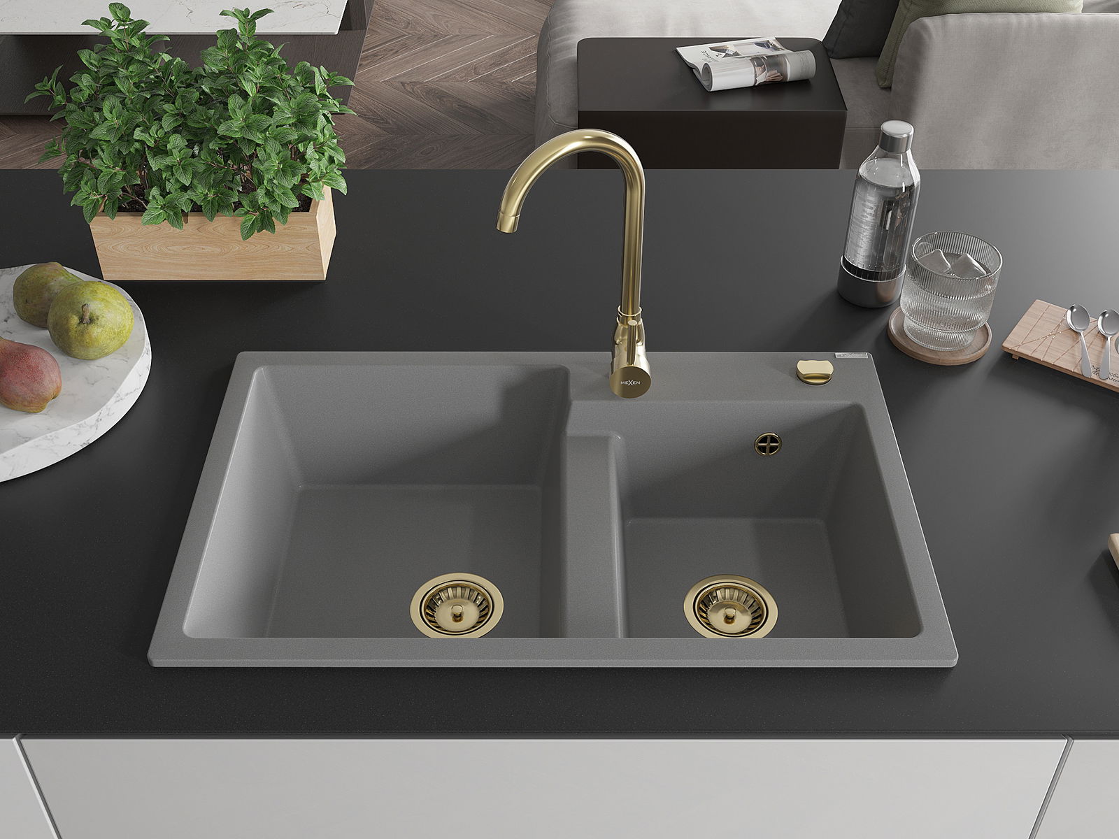 Mexen Tomas granite kitchen sink 2-bowl with Telma kitchen tap, grey - 6516-71-670200-50