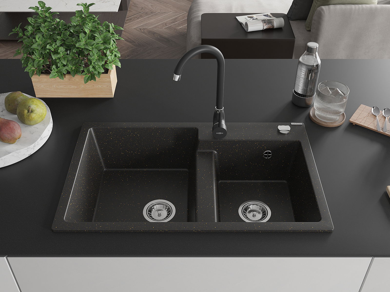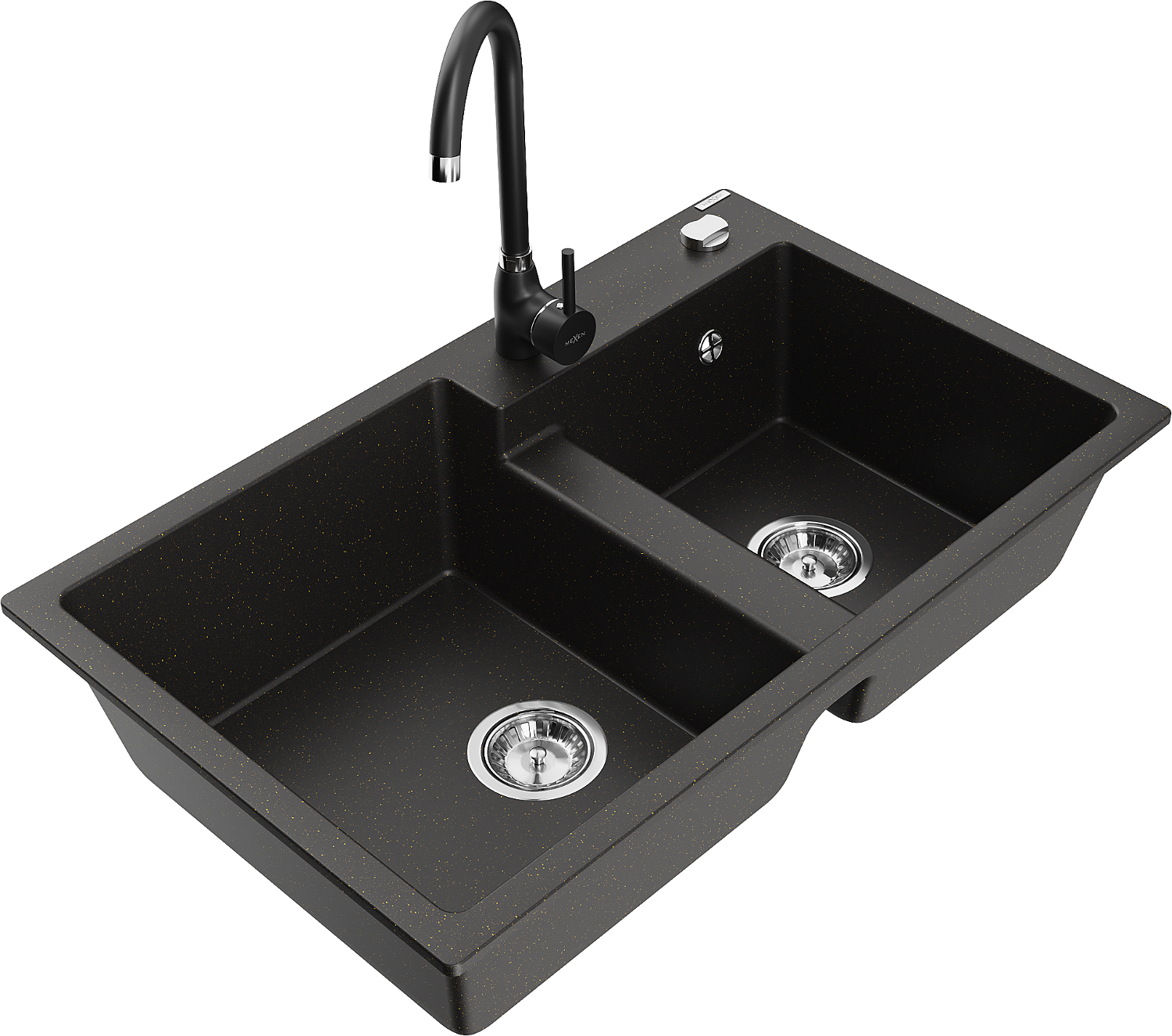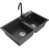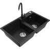 Mexen Tomas granite sink 2-bowl with Telma kitchen tap, black/gold metallic - 6516-75-670200-70