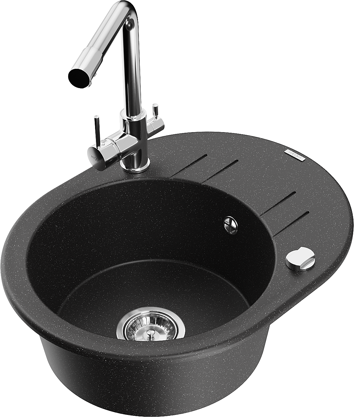 Mexen Kevin Granite Kitchen Sink 1-Bowl with Drainer and Duero Kitchen Tap, Black/Silver Metallic - 6517-73-671600-00