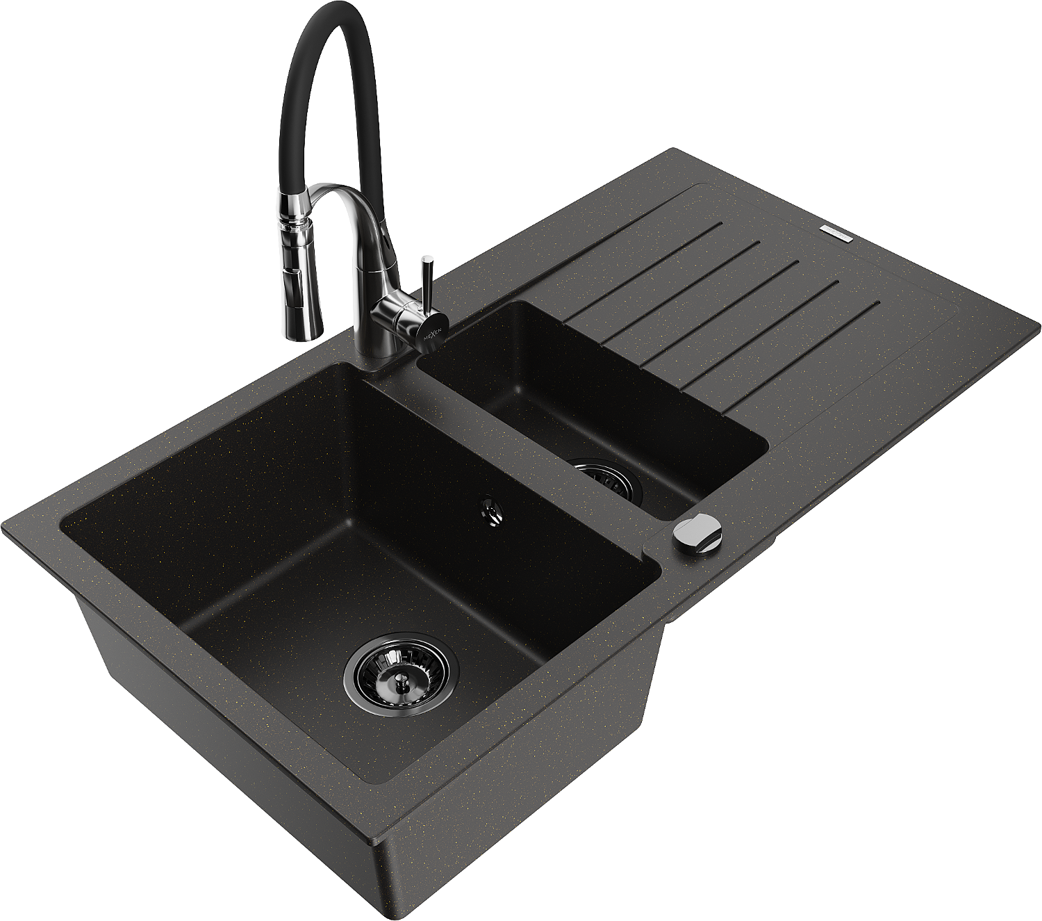 Mexen Matias granite sink 1.5 bowl with drainer and Aster kitchen tap, black/gold metallic - 6502-75-73450-07-B