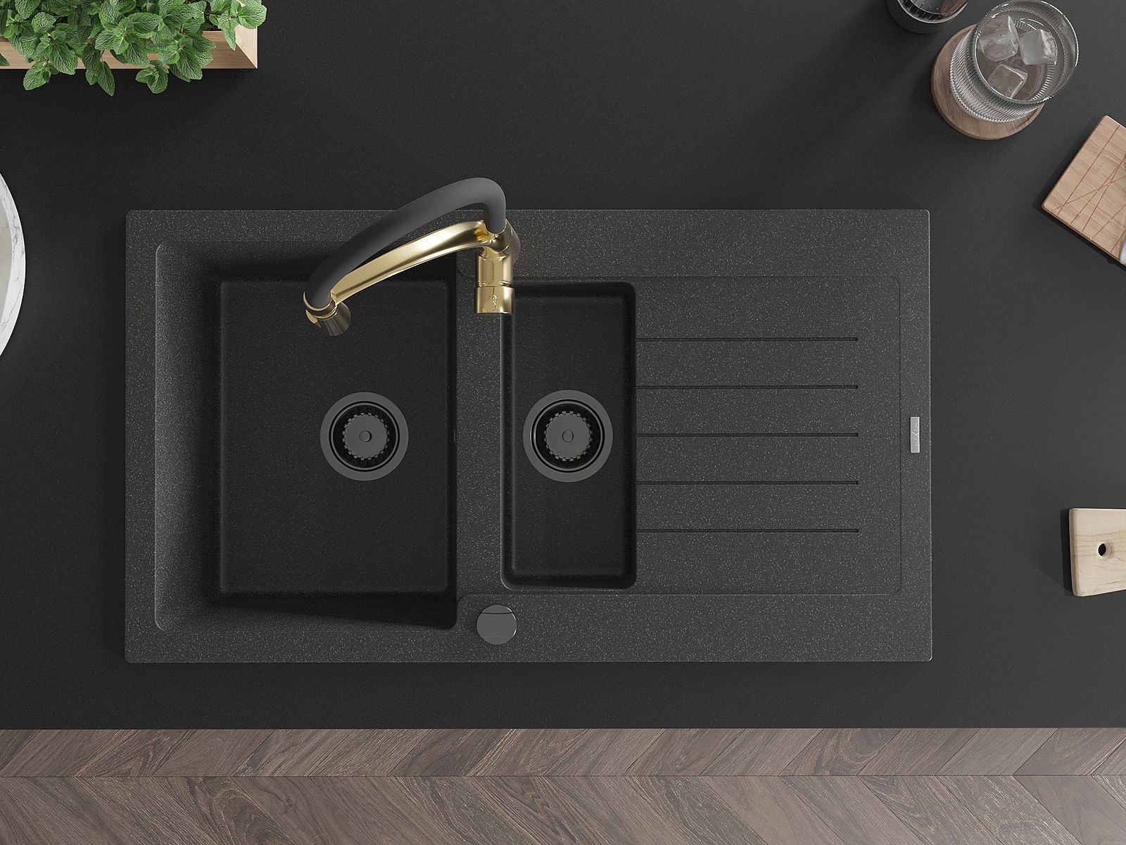 Mexen Matias granite sink 1.5-bowl with drainer and Aster kitchen tap, black speckled - 6502-76-73450-57-B