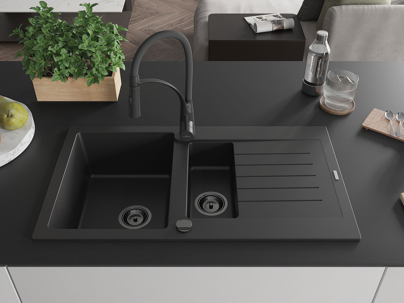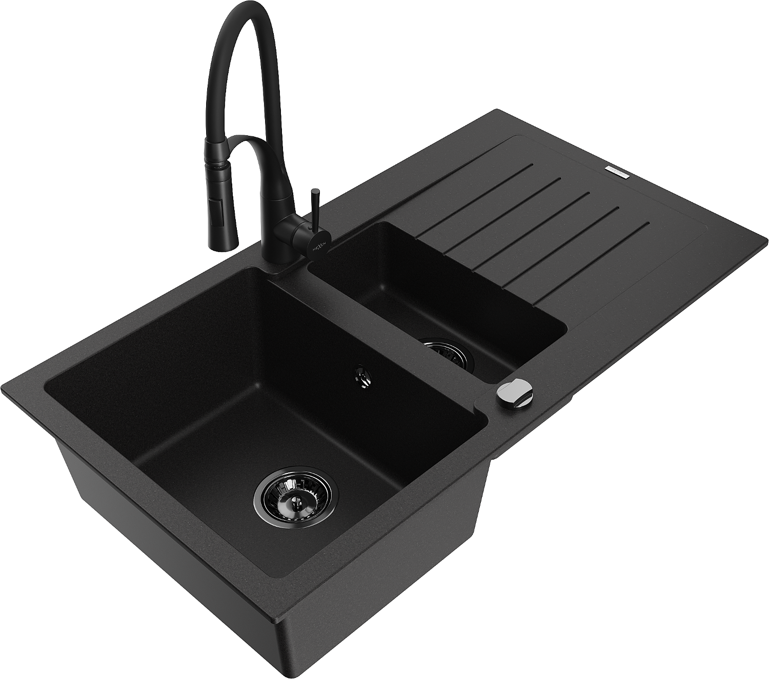 Mexen Matias granite sink 1.5-bowl with drainer and Aster kitchen tap, black - 6502-77-73450-70-B