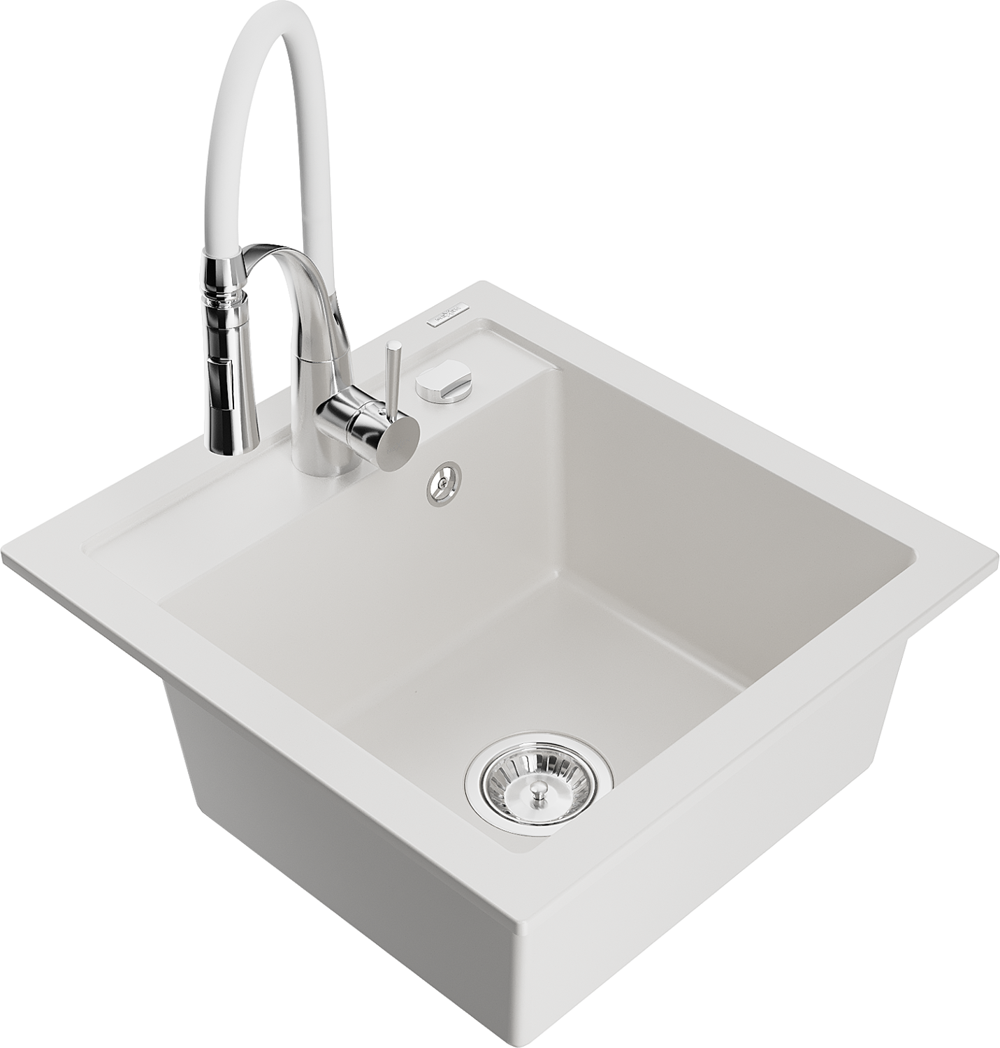 Mexen Vito 1-bowl granite sink with Aster kitchen tap, white - 6503-20-73450-02