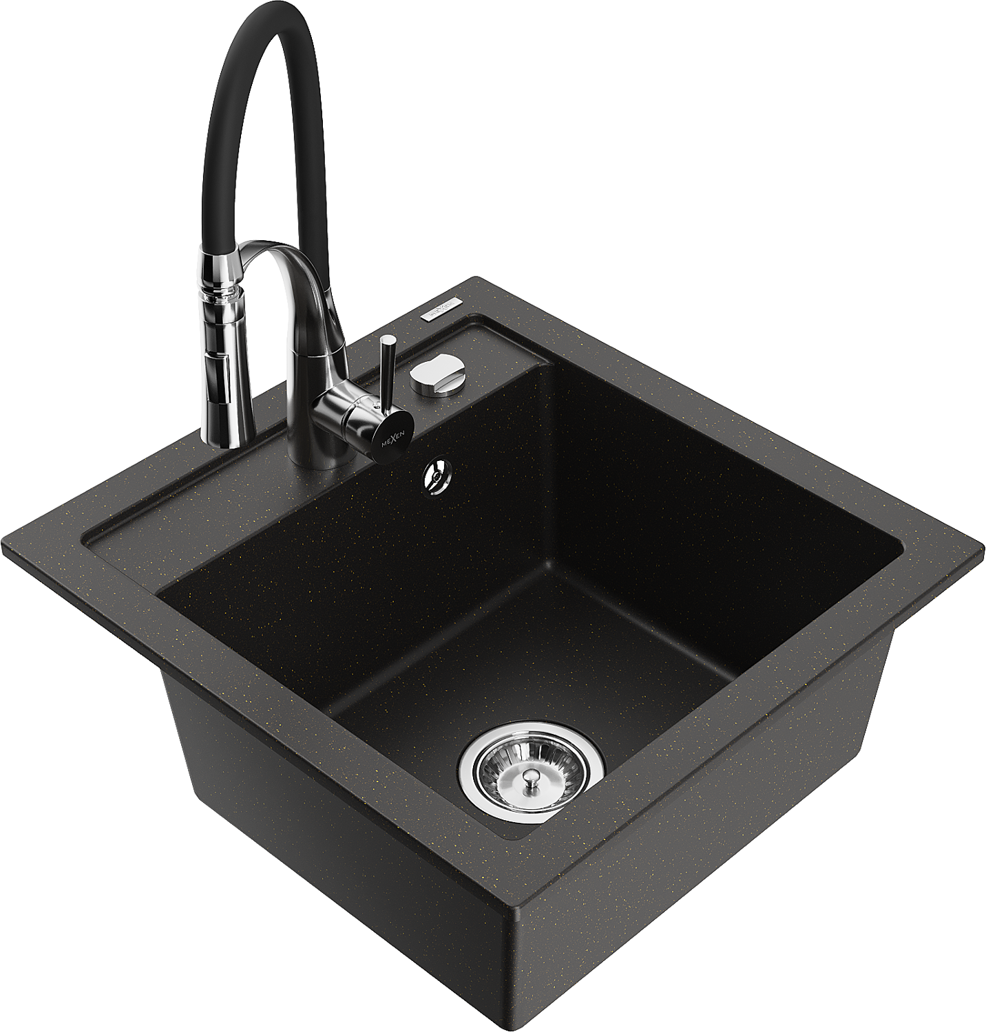 Mexen Vito 1-bowl Granite Sink with Aster Kitchen Tap, Black/Gold Metallic- 6503-75-73450-07