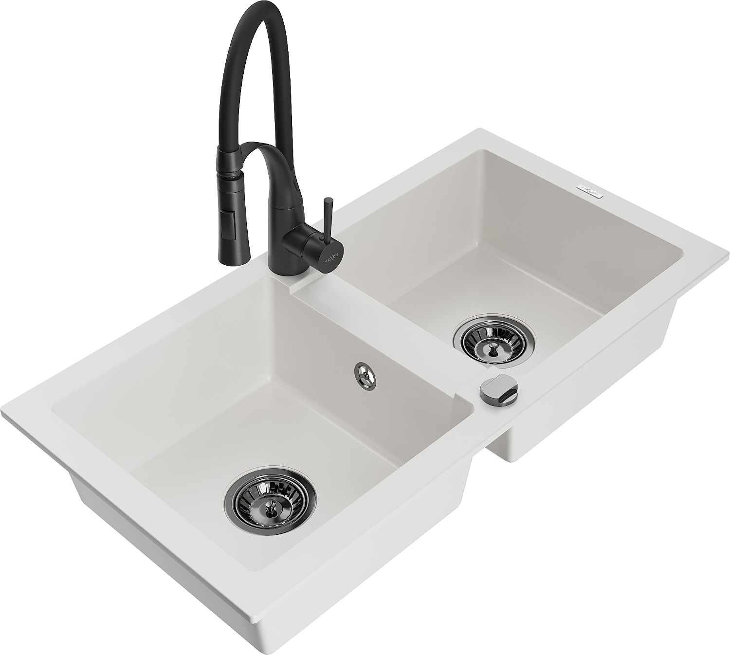 Mexen Mario granite sink 2-compartment with Aster kitchen tap, white - 6504-20-73450-70-B