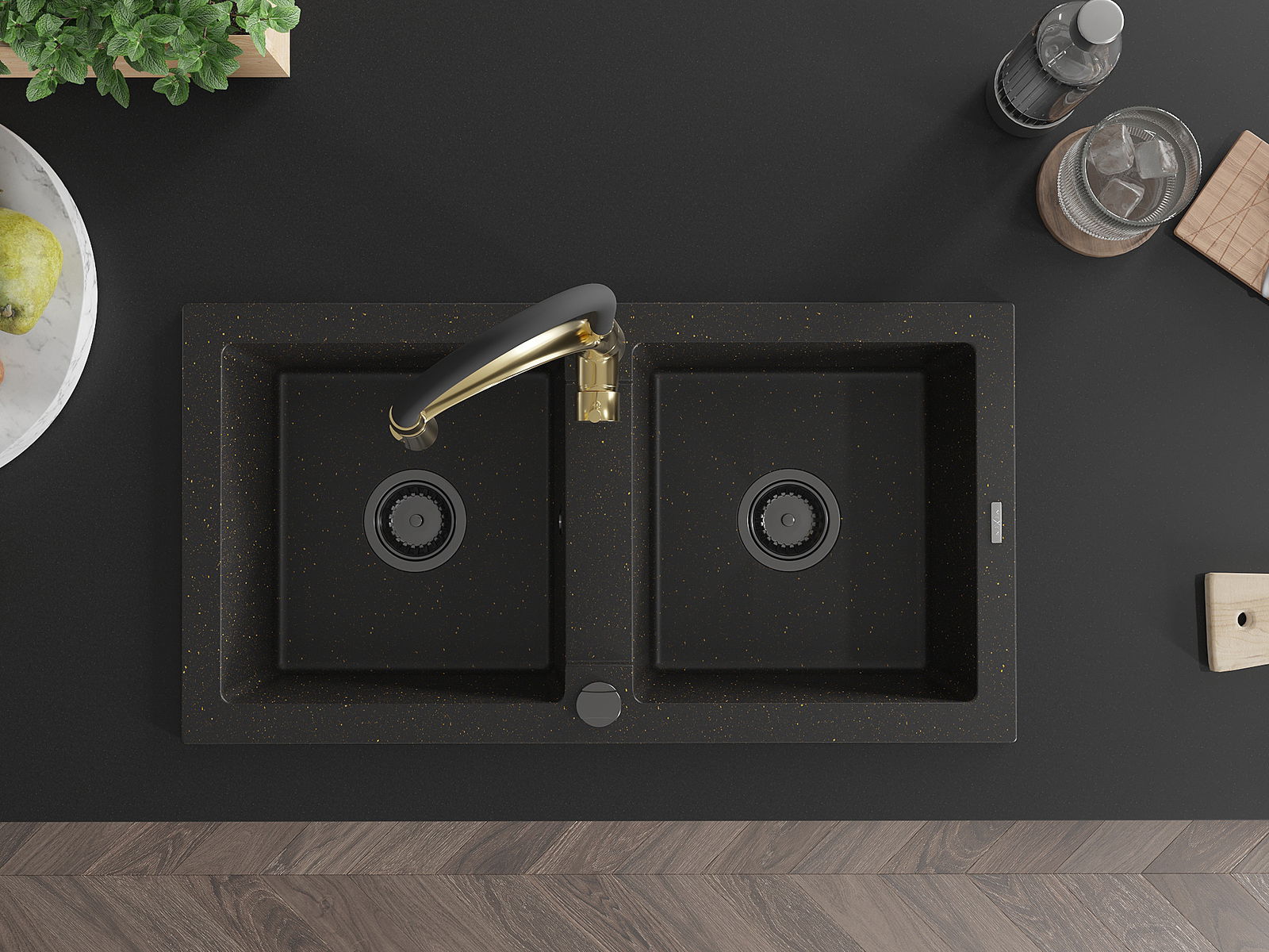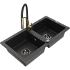 Mexen Mario granite sink 2-bowl with Aster kitchen tap, black/gold metallic - 6504-75-73450-57-B