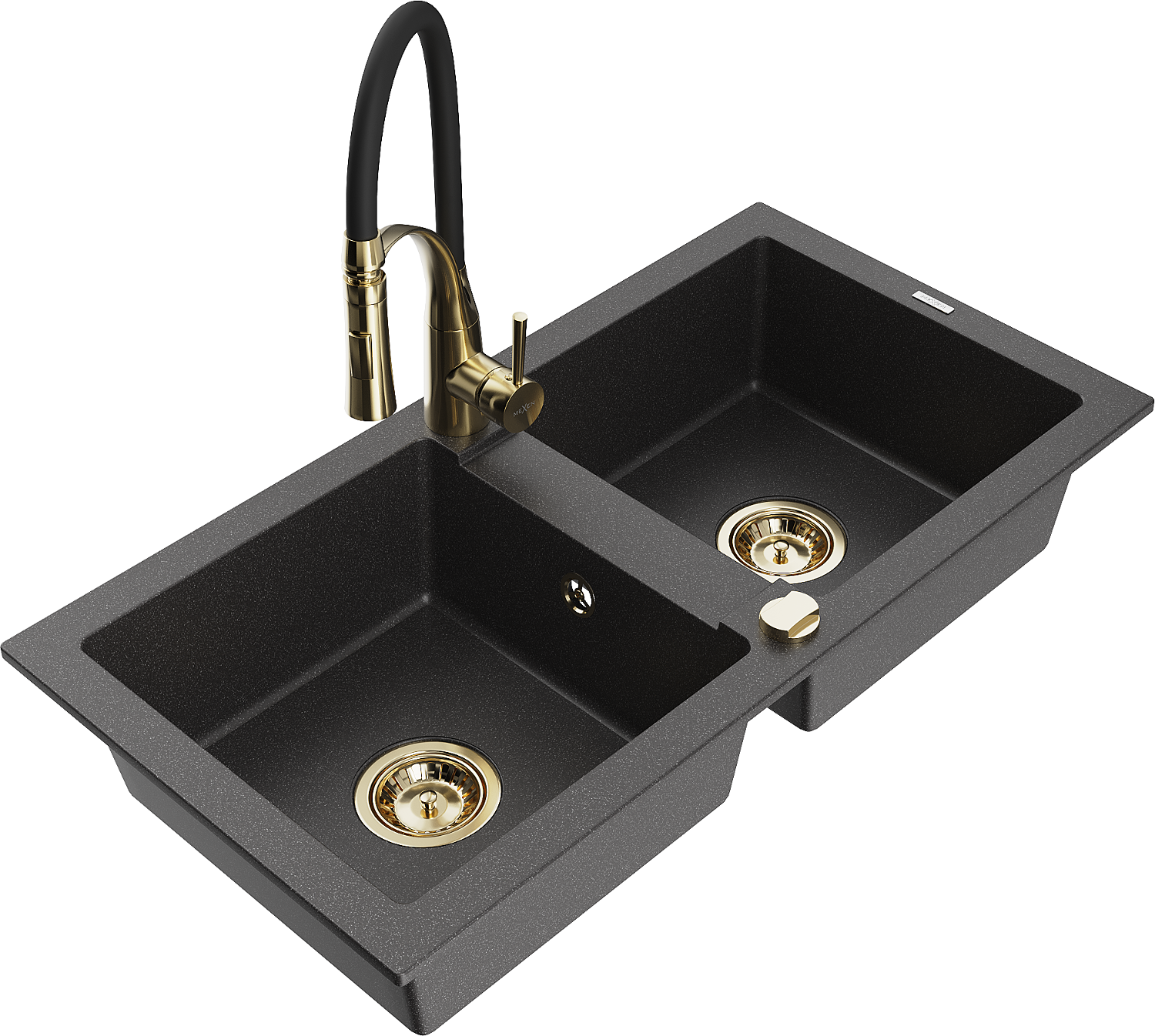 Mexen Mario granite sink 2-bowl with Aster kitchen tap, black speckled - 6504-76-73450-57-G