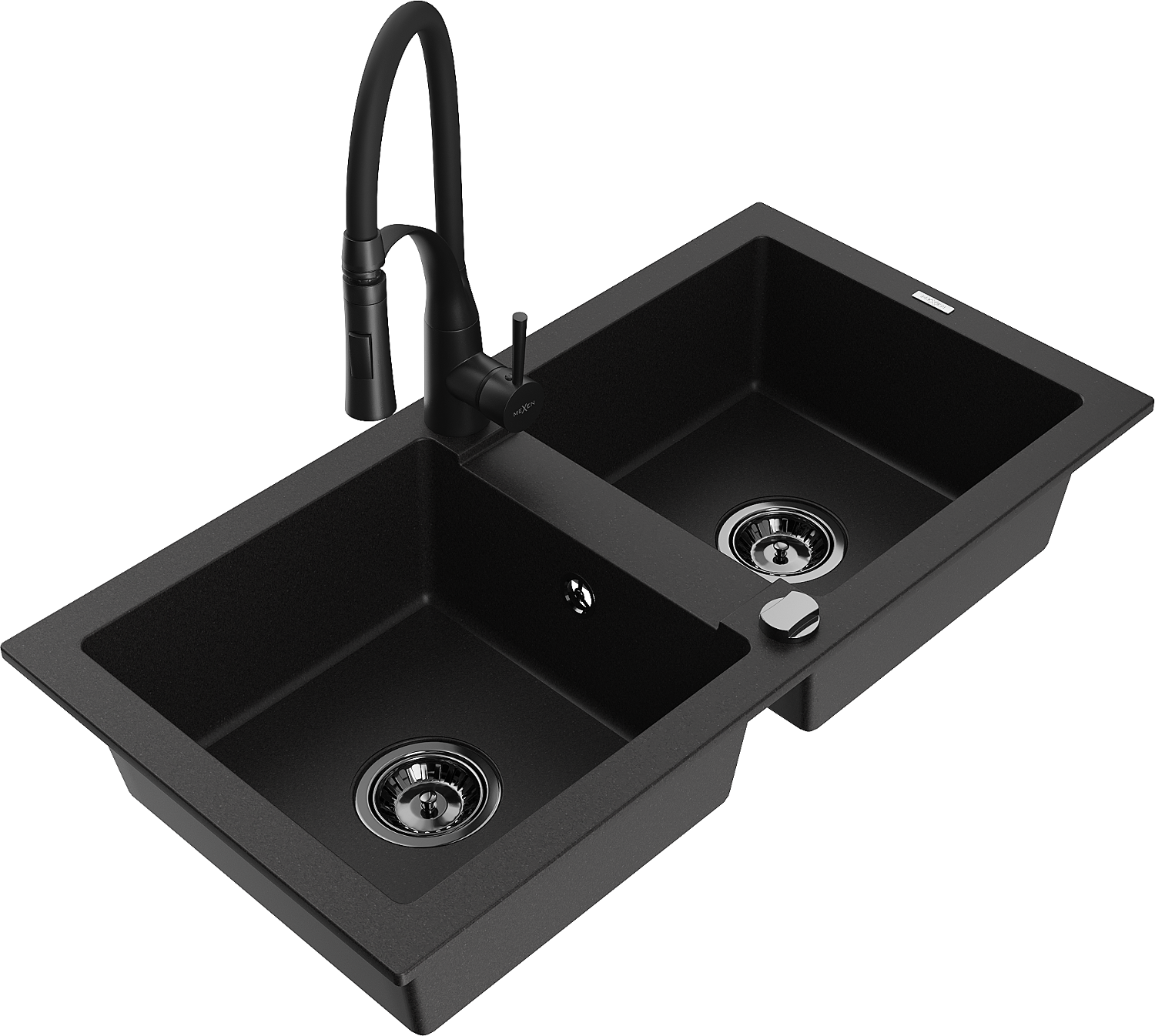 Mexen Mario granite sink with two bowls and Aster kitchen tap, black - 6504-77-73450-70-B