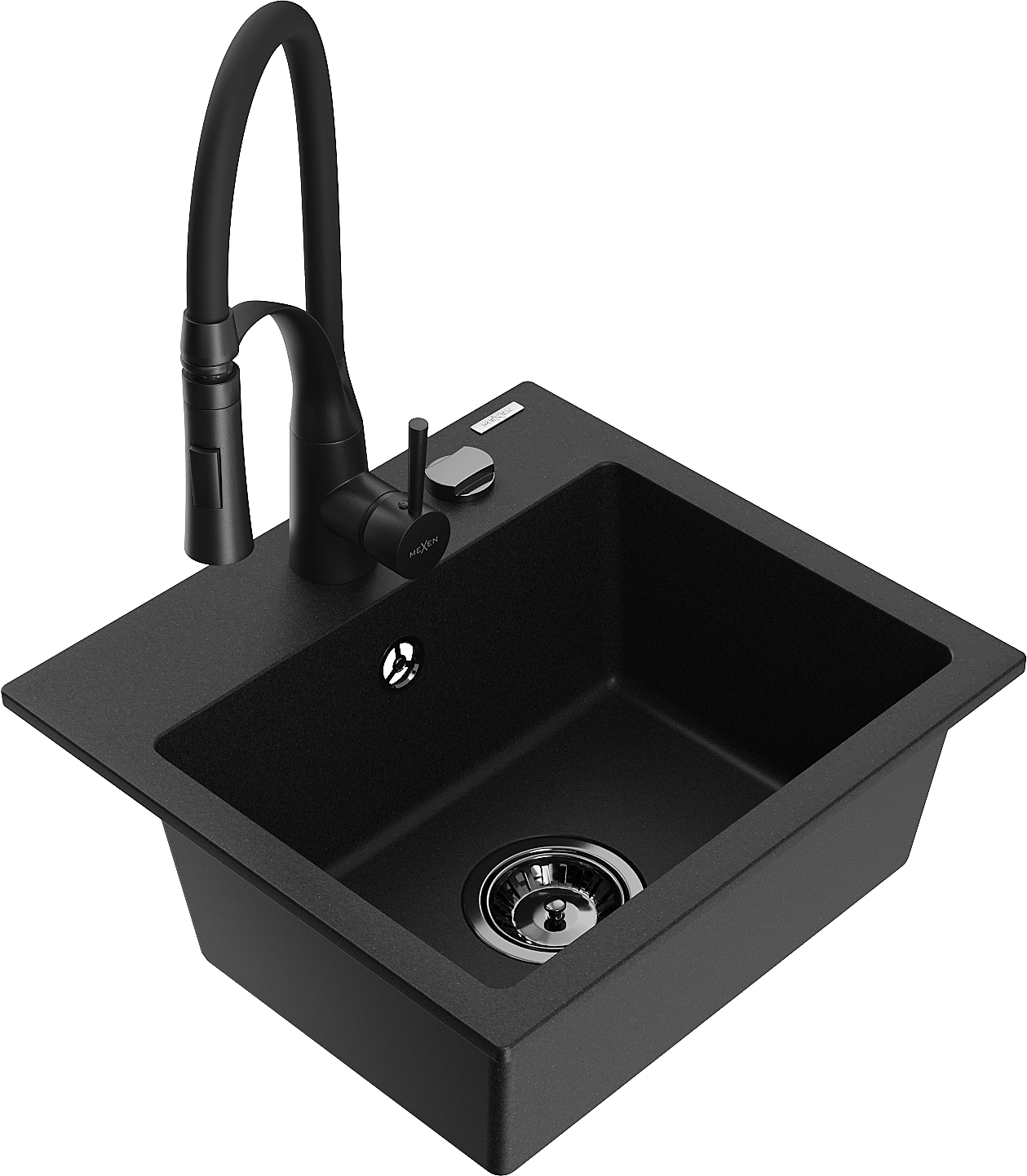 Mexen Milo granite sink 1-bowl with Aster kitchen tap, black - 6505-77-73450-70-B