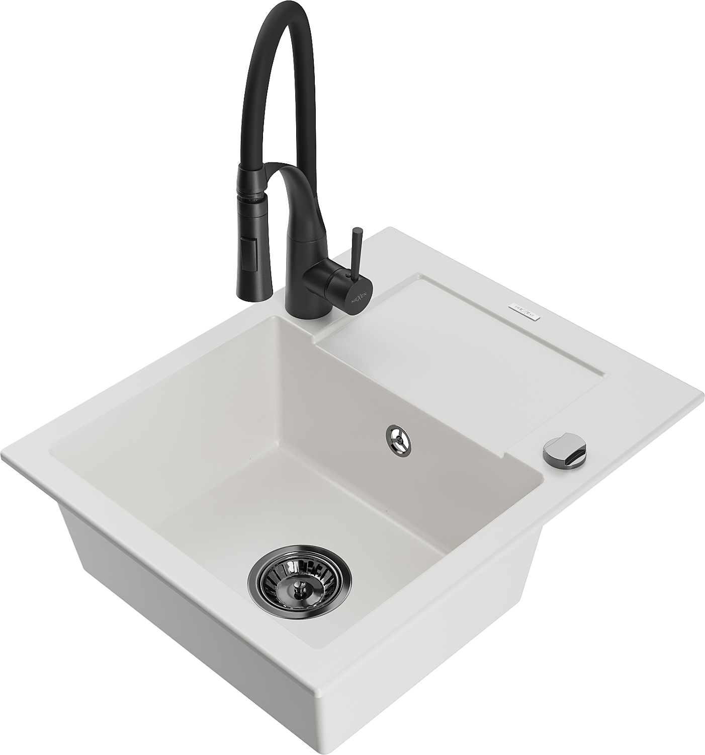 Mexen Enzo 1-Bowl Granite Sink with Drainer and Aster Kitchen Tap, White - 6506-20-73450-70-B