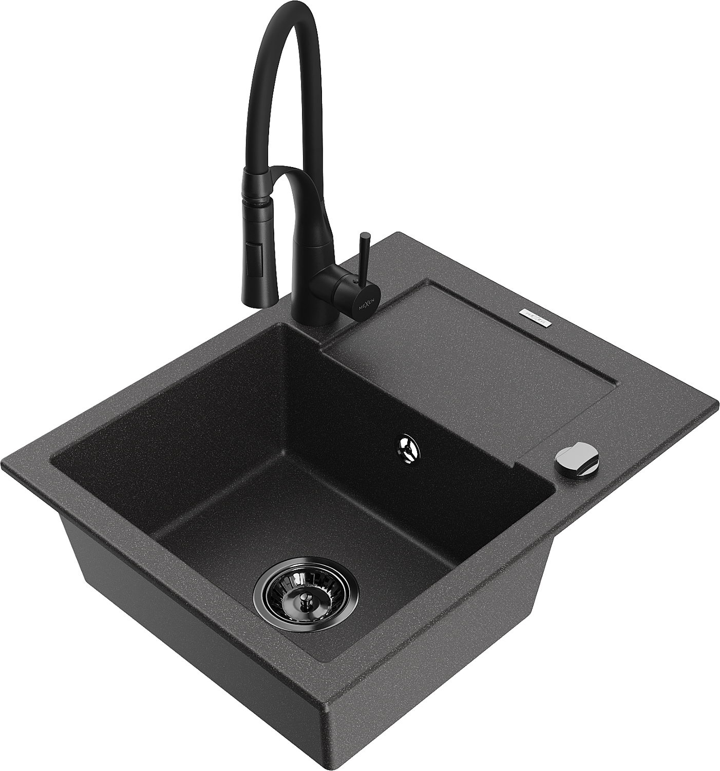 Mexen Enzo 1-bowl granite sink with drainer and Aster kitchen tap, speckled black - 6506-76-73450-70-B