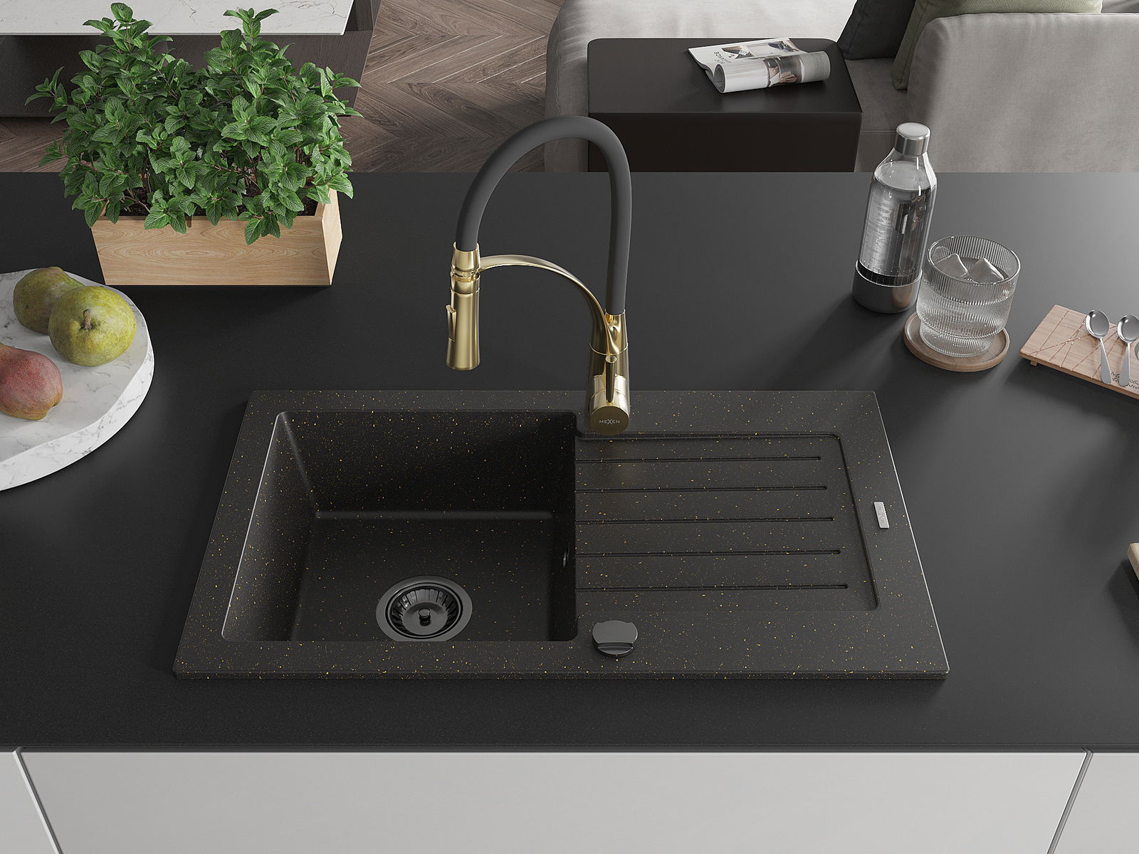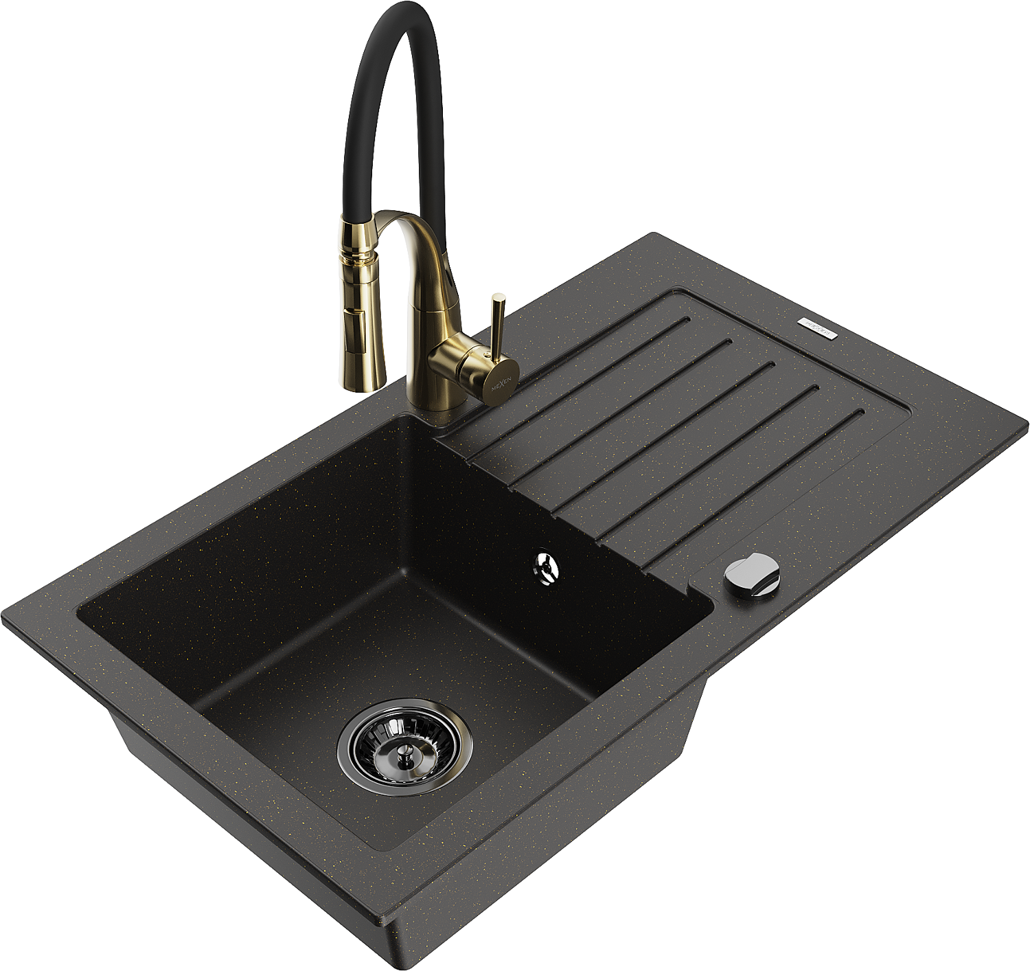 Mexen Pablo granite kitchen sink 1-bowl with drainer and Aster kitchen tap, black/gold metallic - 6510-75-73450-57-B