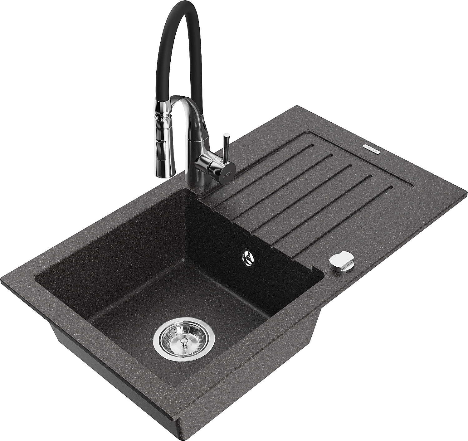 Mexen Pablo granite sink with 1 basin, drainer, and Aster kitchen tap, speckled black - 6510-76-73450-07