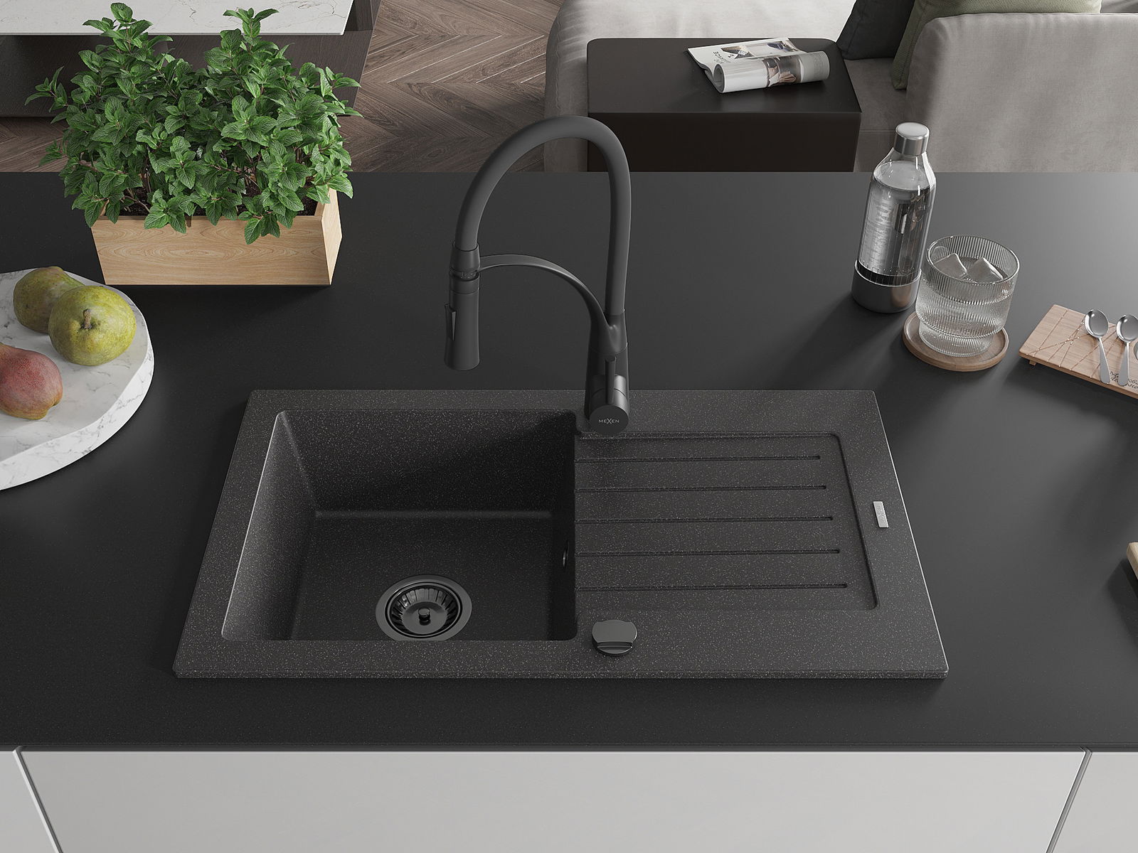 Mexen Pablo granite sink 1-bowl with drainer and Aster kitchen tap, black speckled - 6510-76-73450-70-B
