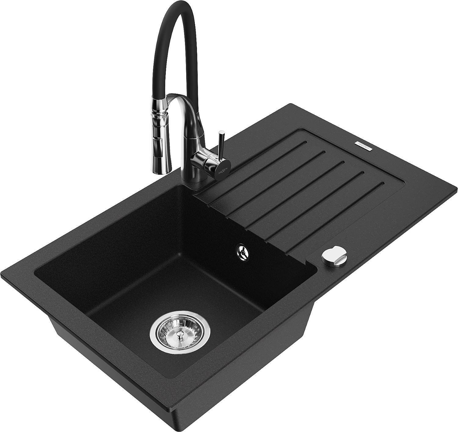 Mexen Pablo granite sink 1-bowl with drainer and Aster kitchen tap, black - 6510-77-73450-07