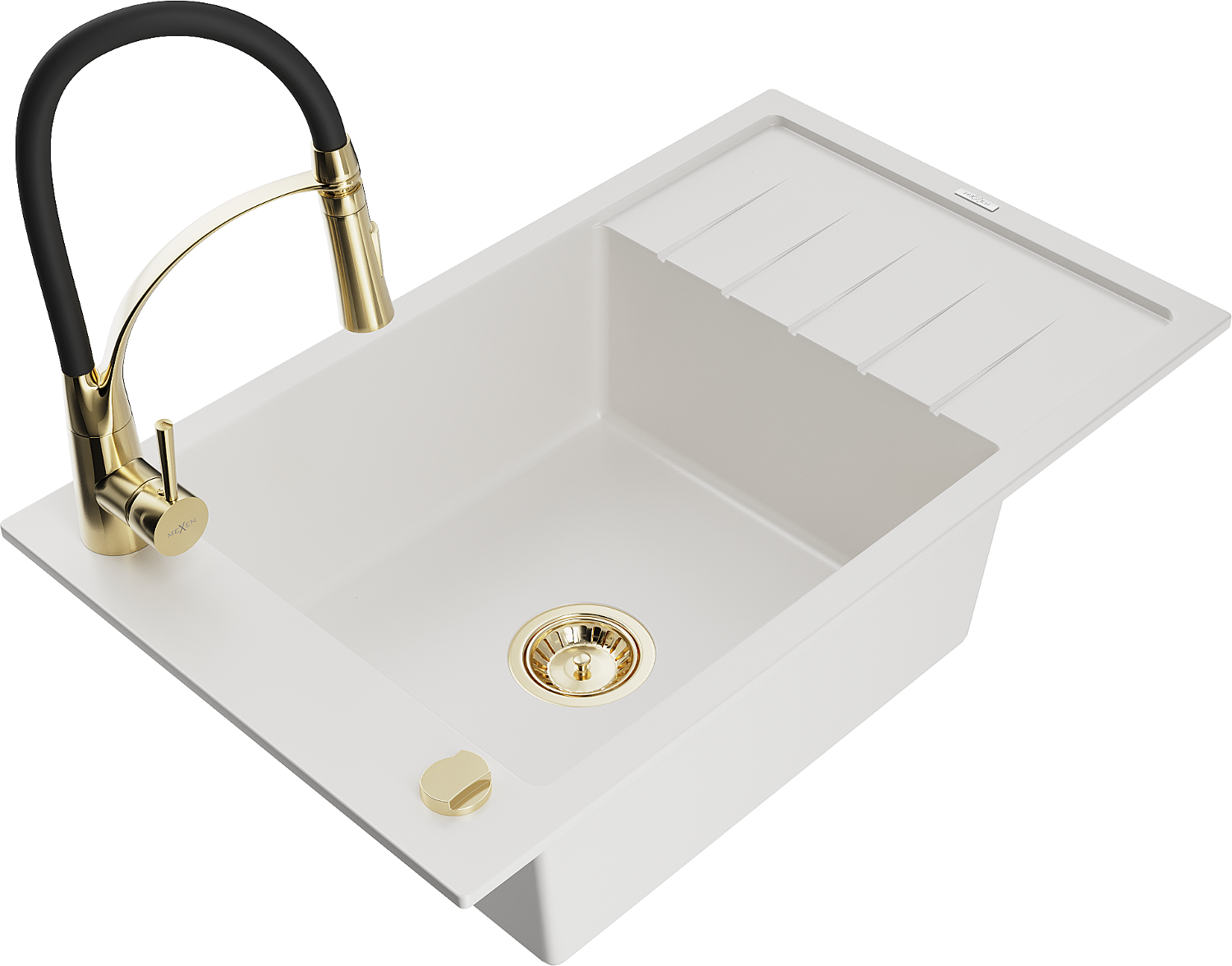 Mexen Elias granite sink 1-bowl with drainer and Aster kitchen tap, white - 6511-20-73450-57-G