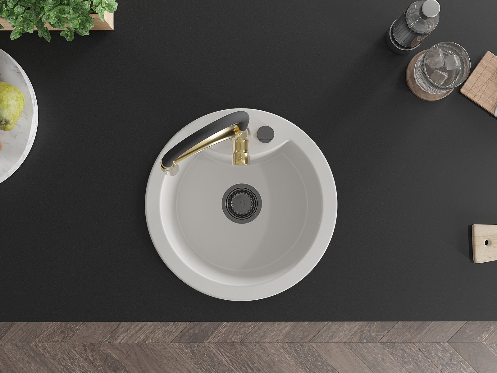 The surface of the sink is resistant to stains and discolouration, making it easy to maintain cleanliness and retain its colour for a long time of use. An aesthetic and practical addition to any kitchen.