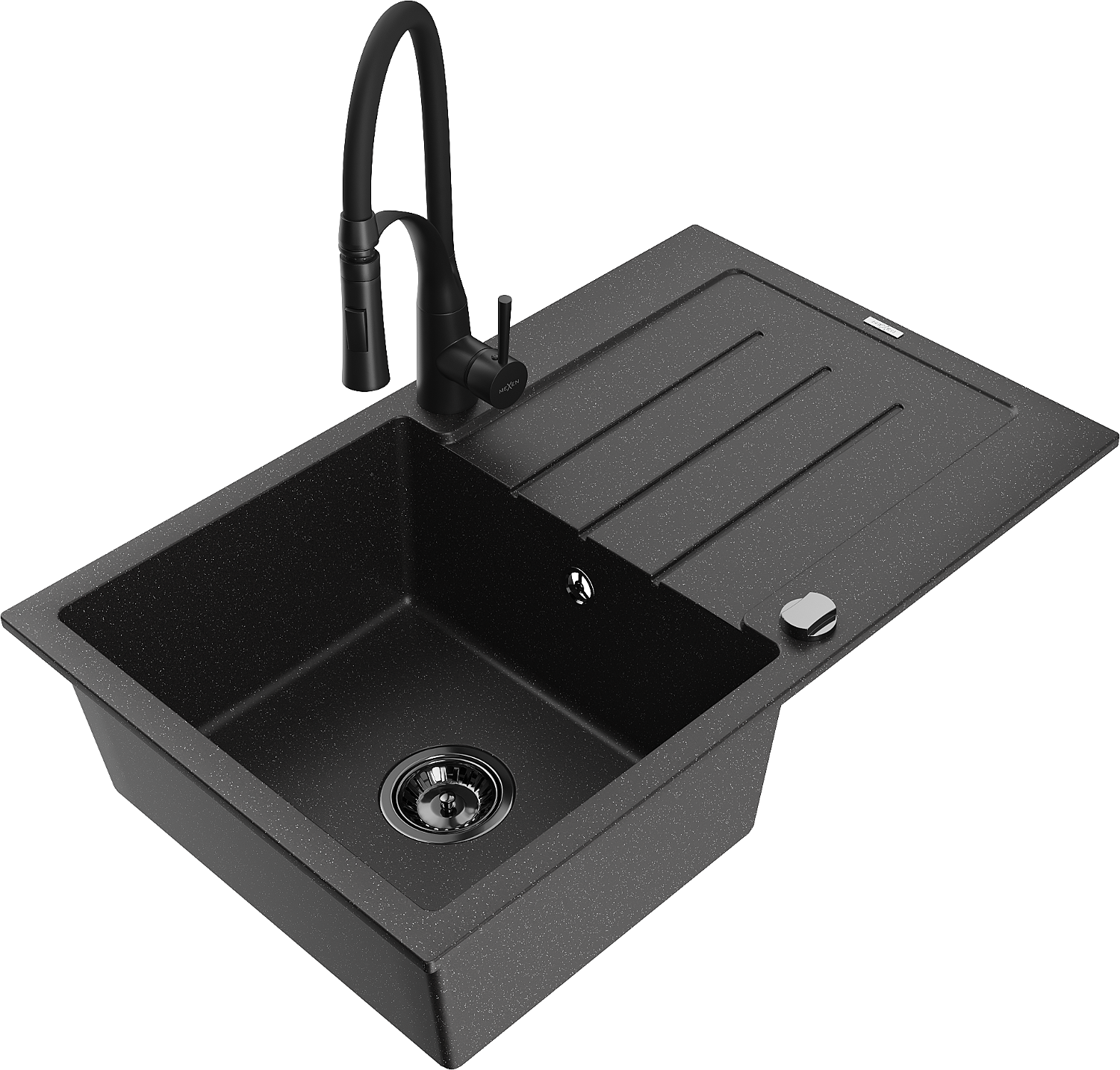 Mexen Bruno 1-bowl granite sink with drainer and Aster kitchen tap, black/silver metallic - 6513-73-73450-70-B