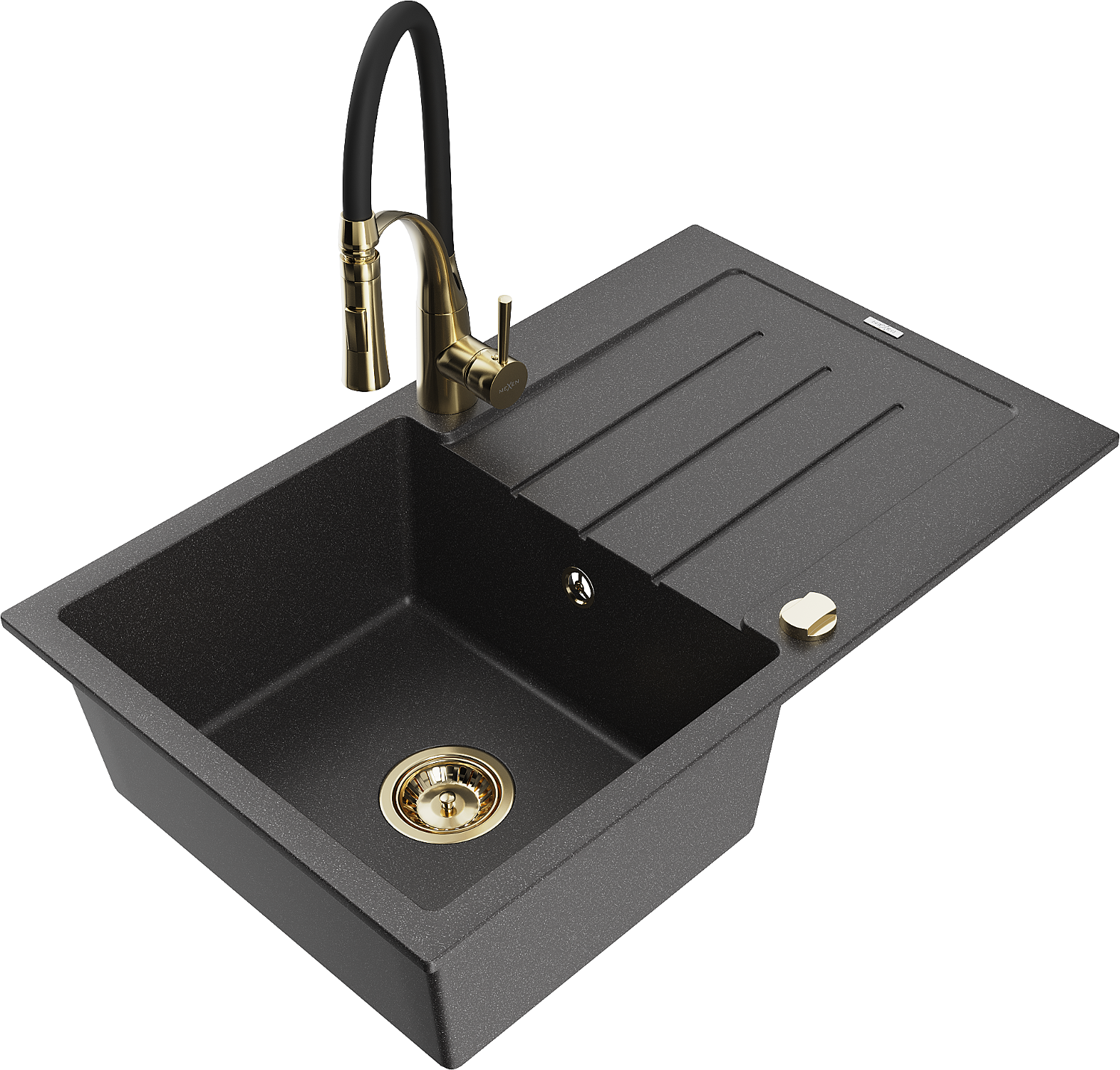 Mexen Bruno granite sink 1-bowl with drainer and Aster kitchen tap, black speckled - 6513-76-73450-57-G