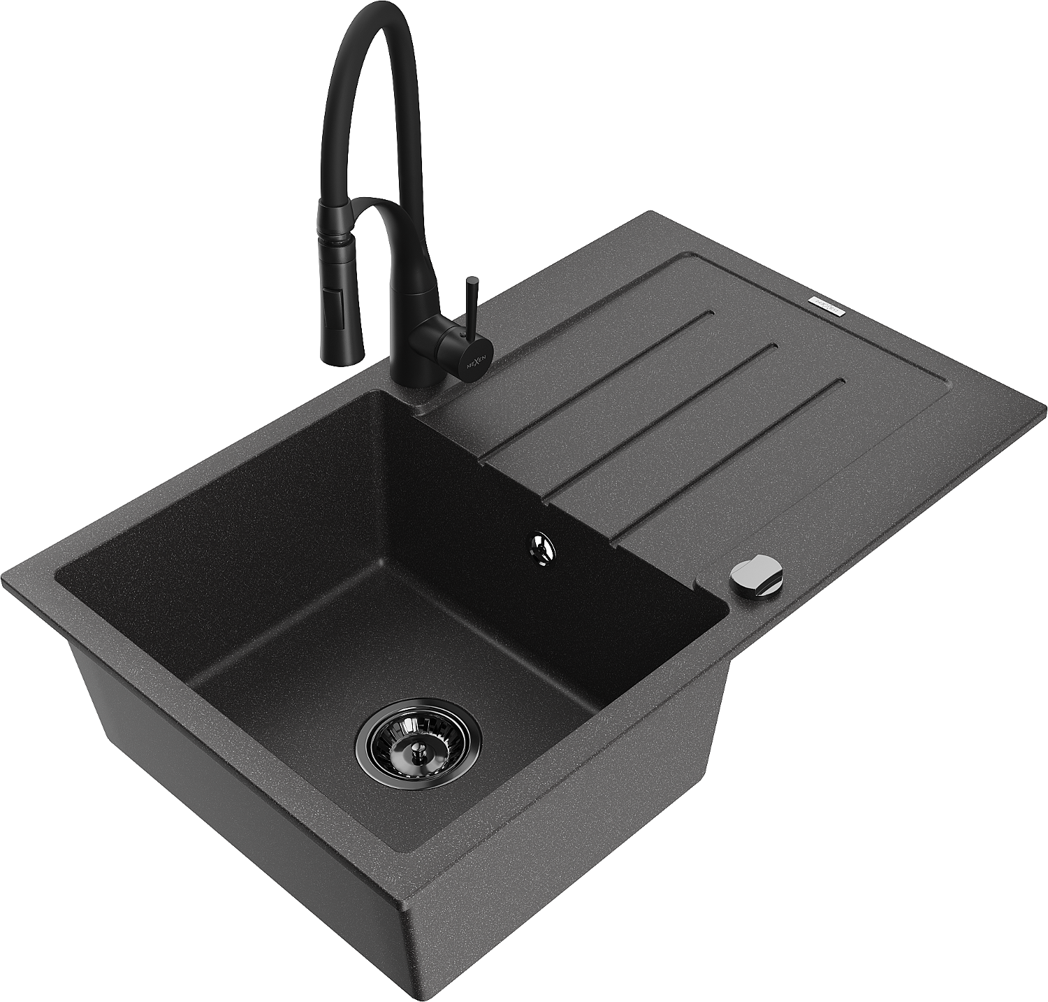 Mexen Bruno granite kitchen sink 1-bowl with drainer and Aster kitchen tap, speckled black - 6513-76-73450-70-B