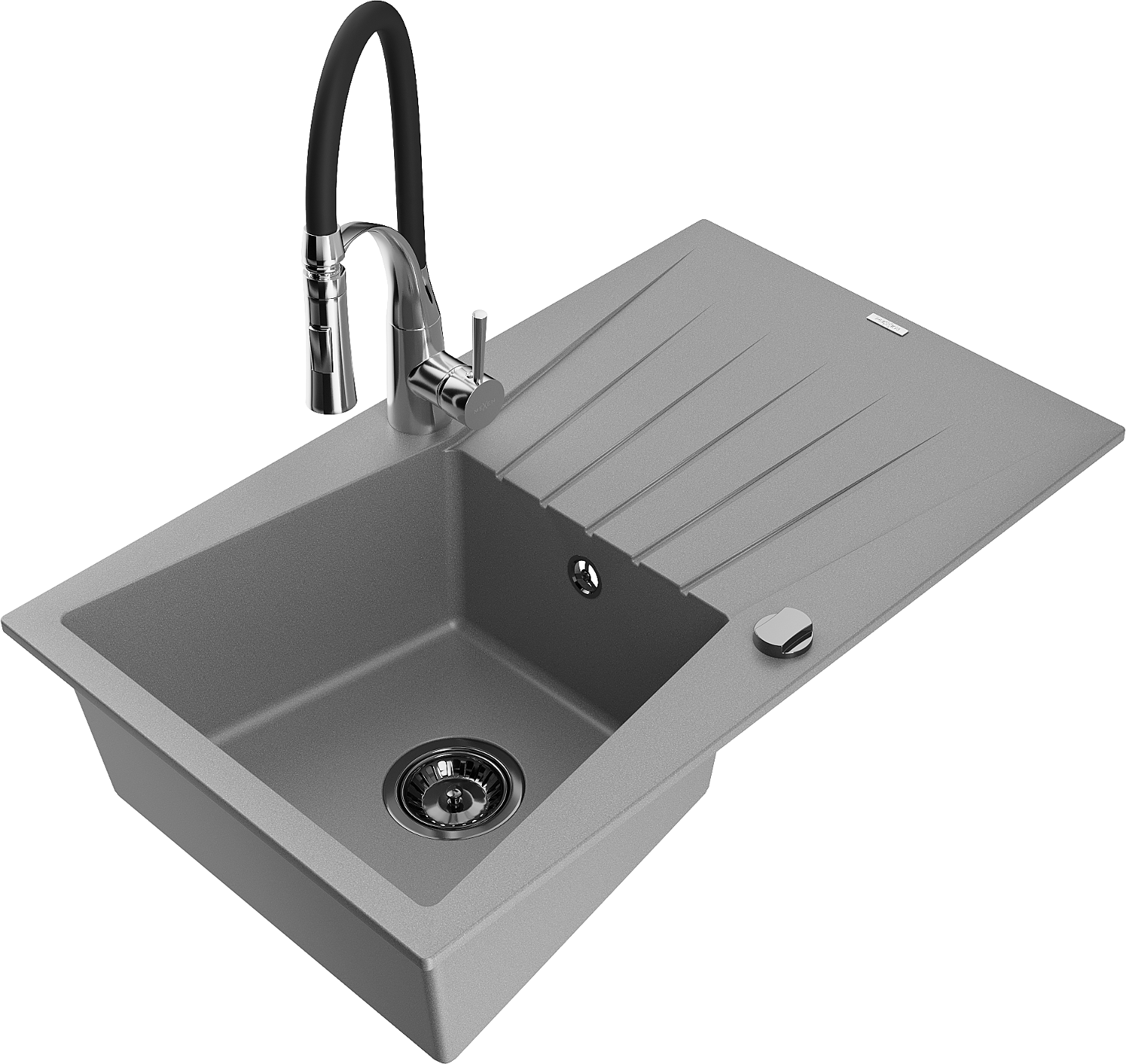 Mexen Cesar 1-Bowl Granite Kitchen Sink with Drainer and Aster Kitchen Tap, Grey - 6514-71-73450-07-B