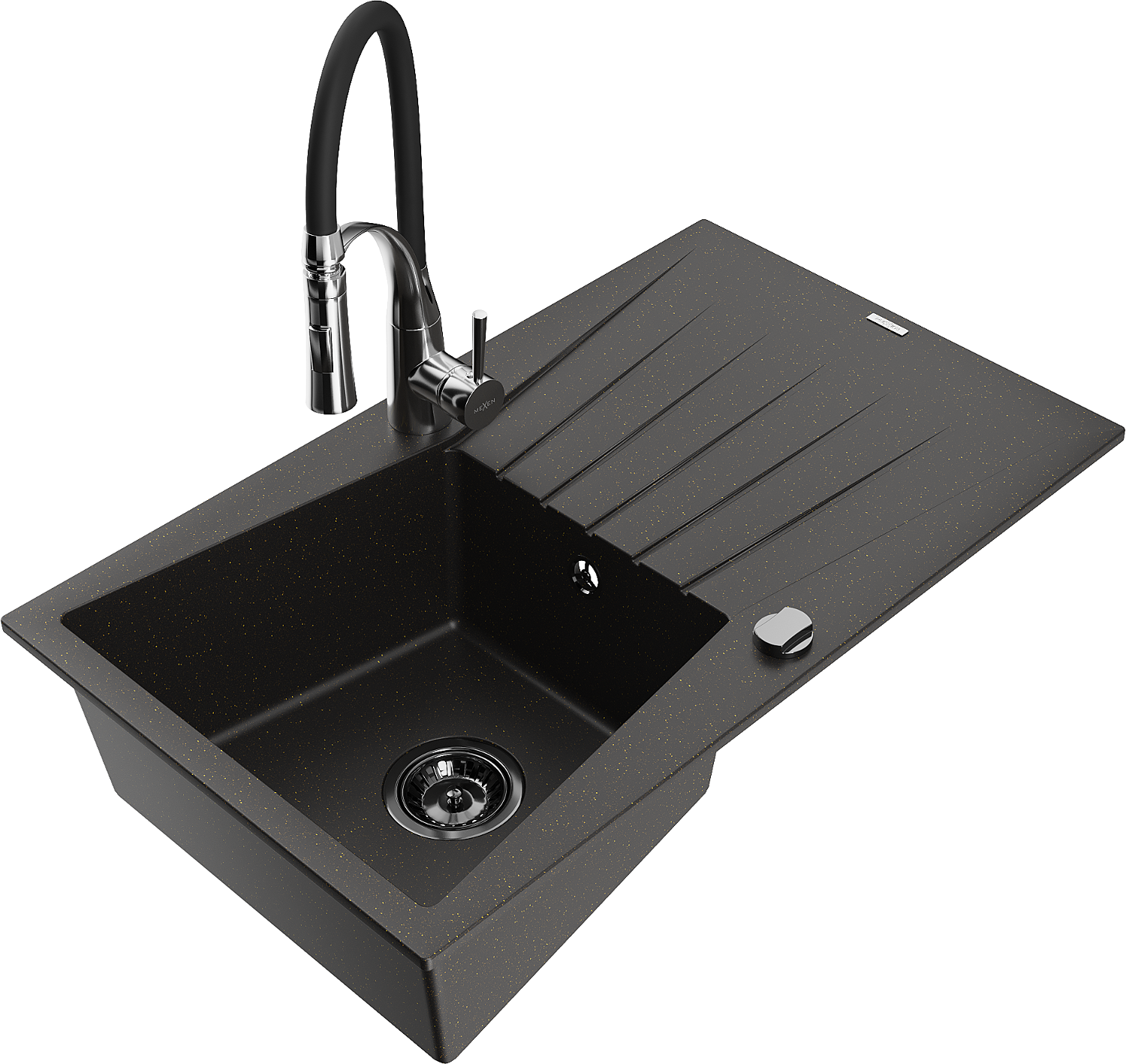 Mexen Cesar single-bowl granite sink with drainer and Aster kitchen tap, black/gold metallic - 6514-75-73450-07-B