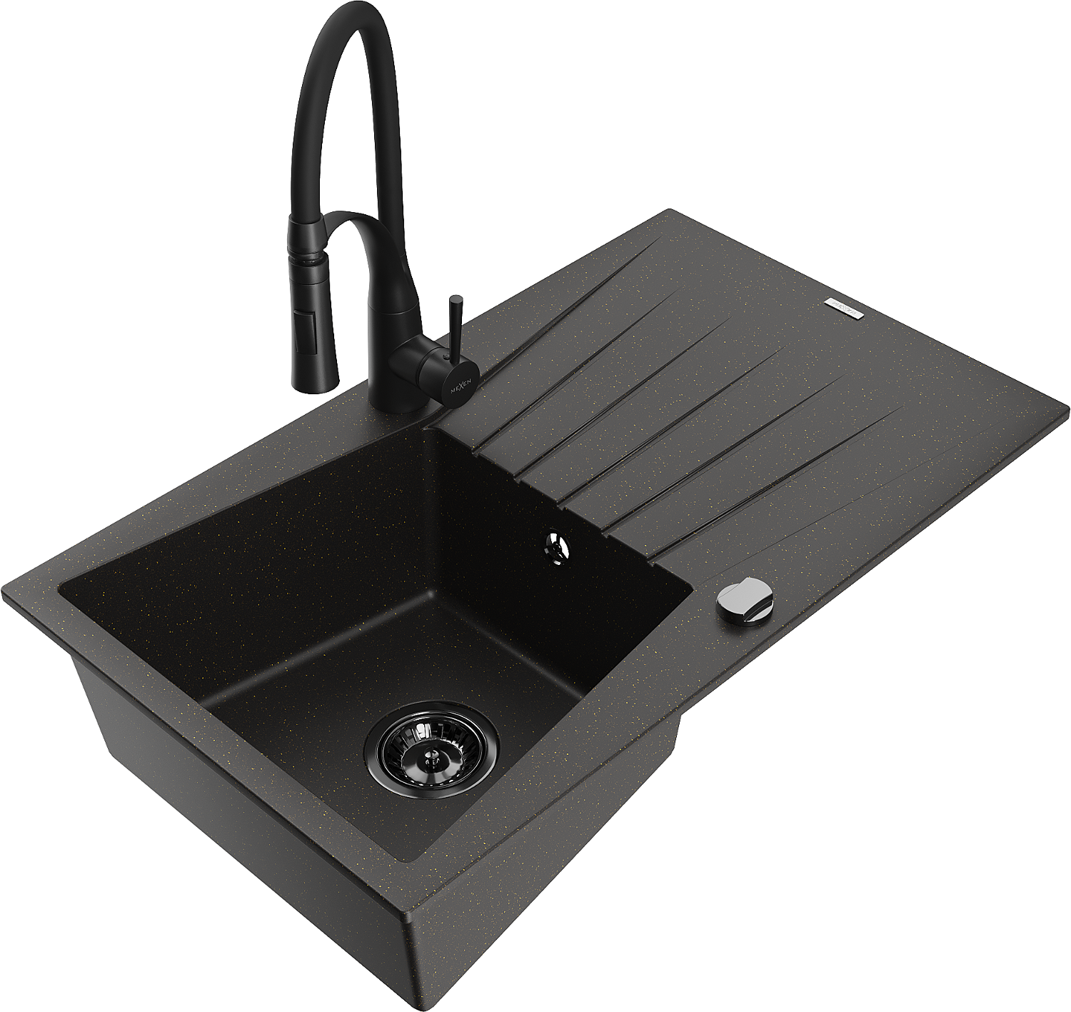 Mexen Cesar granite sink with 1 bowl, drainer and Aster kitchen tap, black/gold metallic - 6514-75-73450-70-B