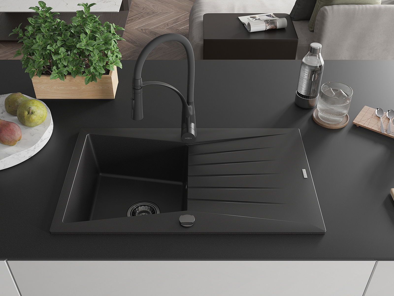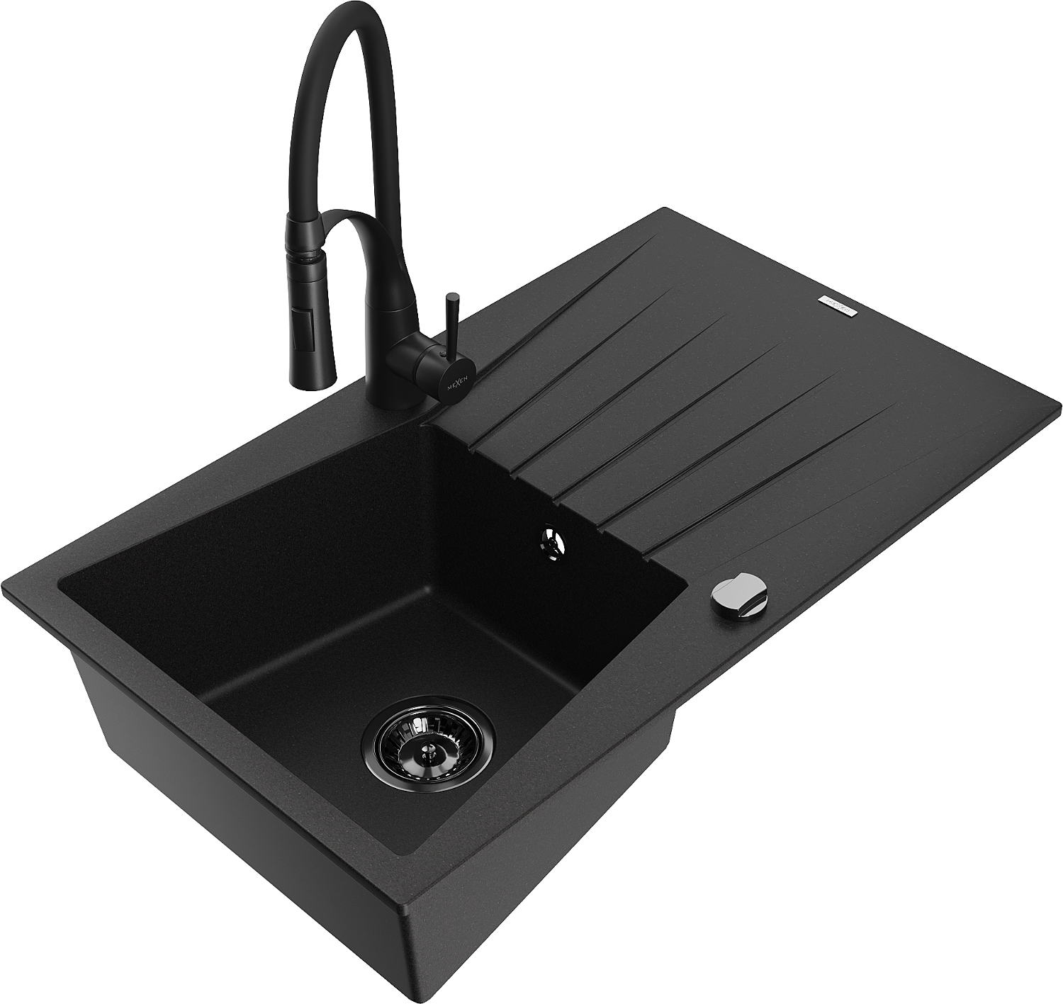 Mexen Cesar granite sink 1-bowl with drainer and Aster kitchen tap, black - 6514-77-73450-70-B