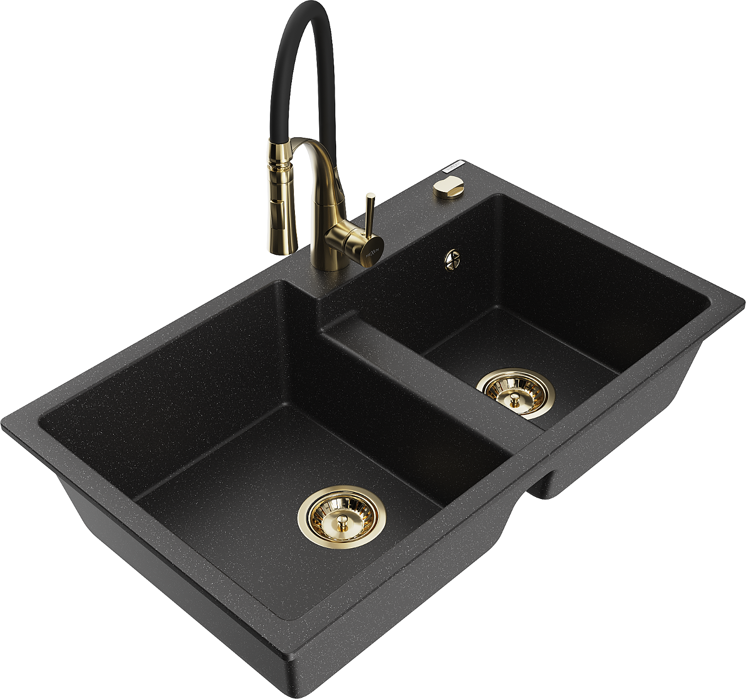 Mexen Tomas granite sink 2-bowl with Aster kitchen tap, black/silver metallic - 6516-73-73450-57-G
